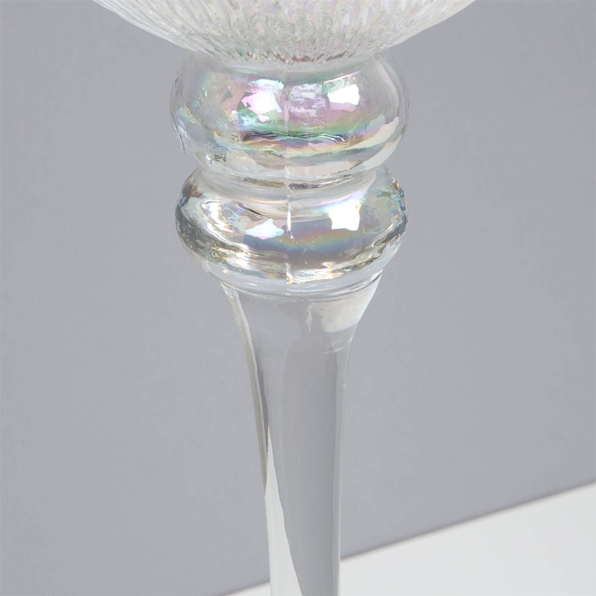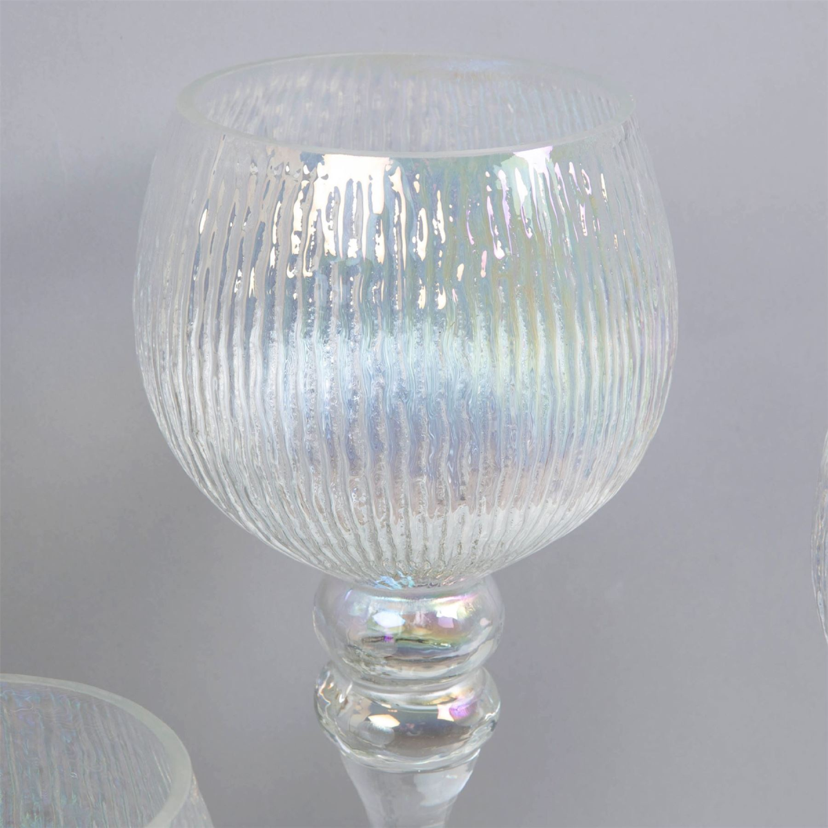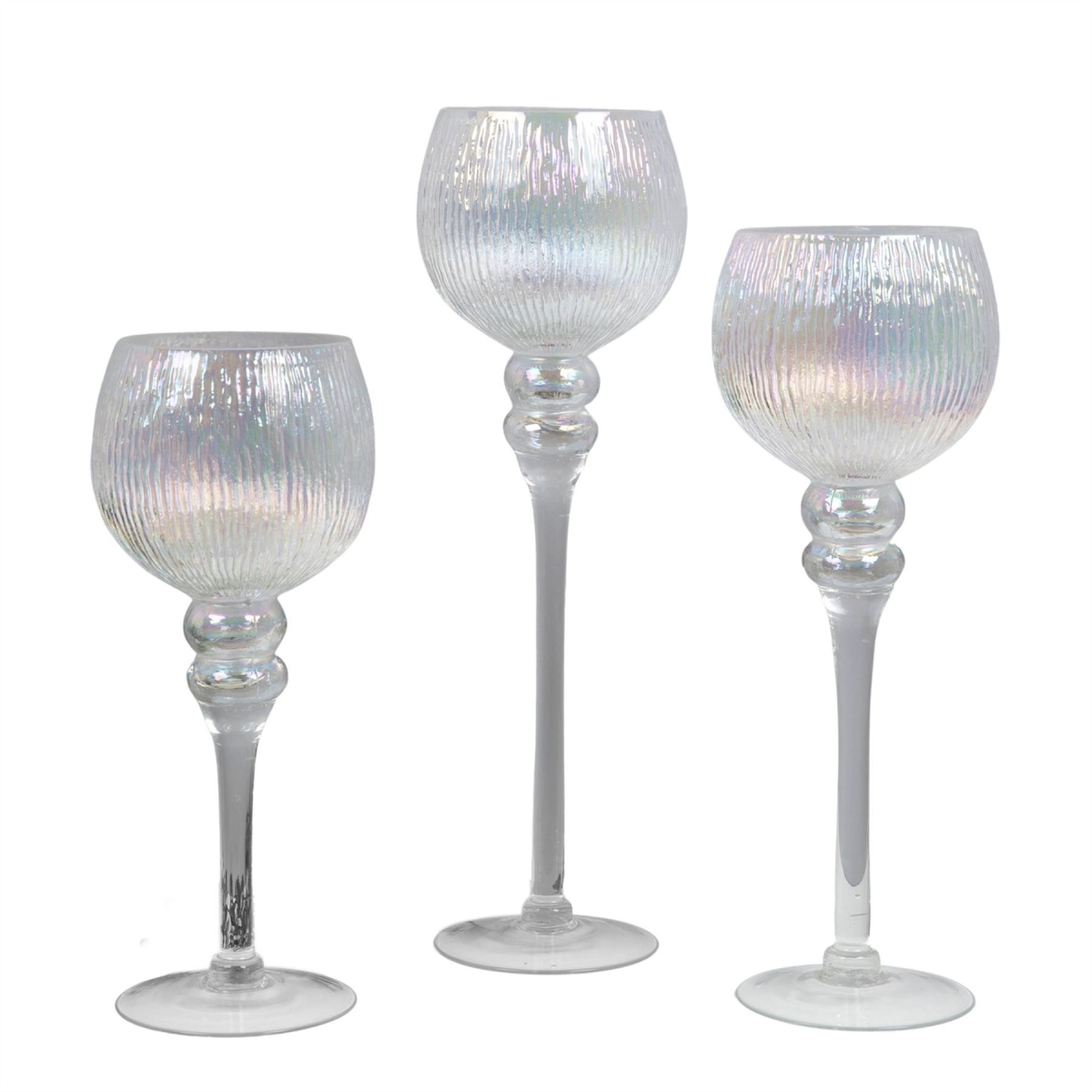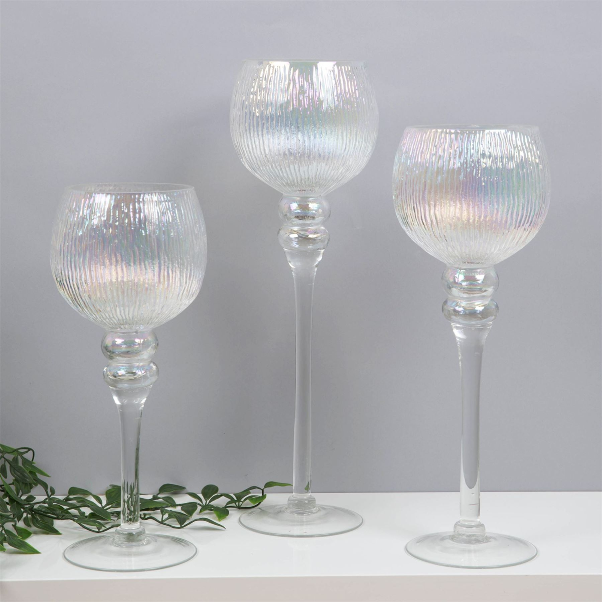 A set of three pearlised glass goblet style candle holders. From the Silver Luxe collection by HESTIA� - Unparalleled glamour, style and elegance in contemporary home and gift. The perfect home accessory to add a touch of sophisticated glamour and sparkle. Large - 40cm Medium - 34.5cm Small - 30cm The goblets can be used to hold candles, tealights, floating candles or even pot pourri and make a great new home gift.