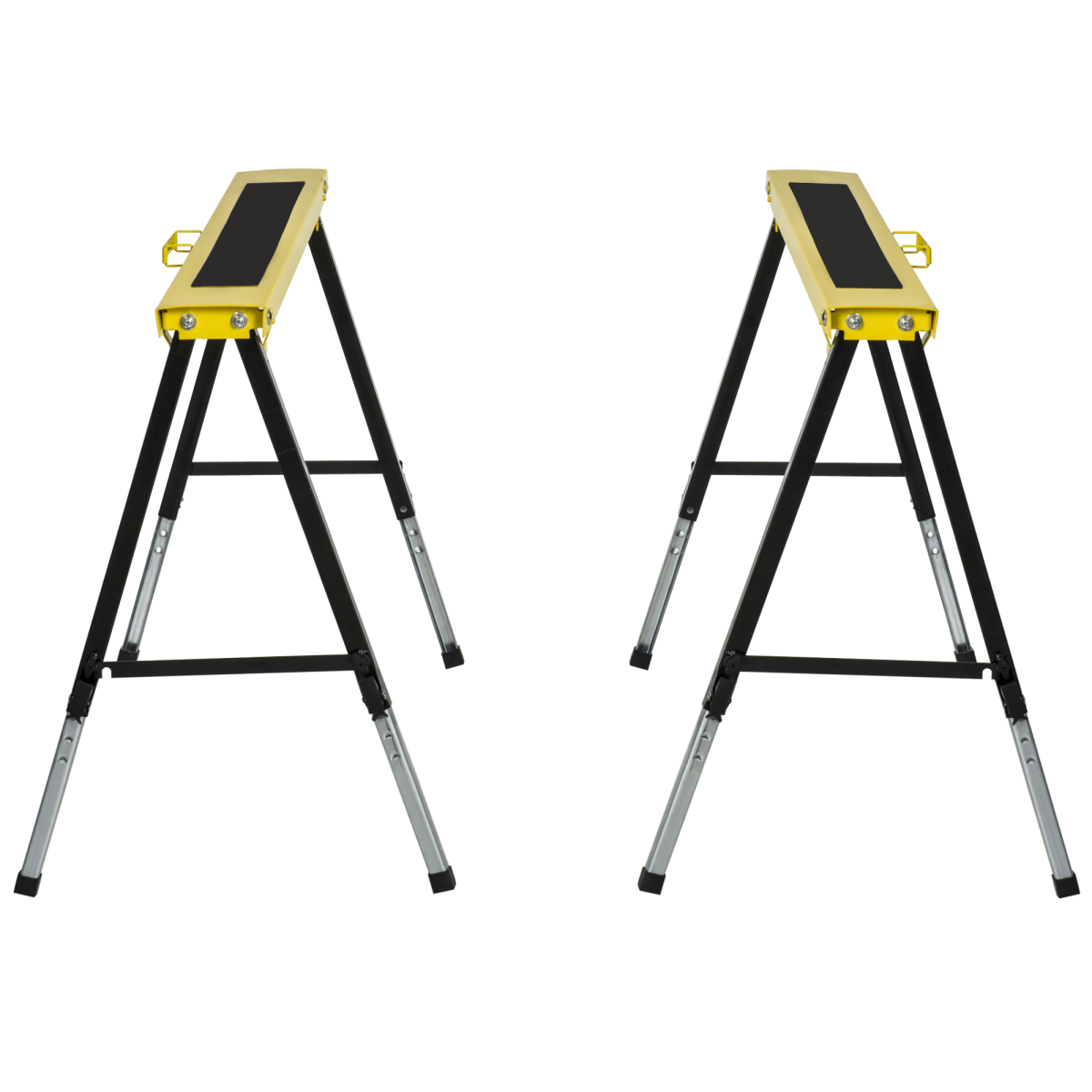 SET OF TWO: 2-piece saw horse with steel construction provides a stable platform when sawing wood. The A-shaped frame makes it more stable. Ideal for cutting wood, suitable for home, moving, warehouse.HEIGHT ADJUSTABLE: The height of the saw horse can be 12 level adjusted from 62 cm to 90 cm to suit your different needs.FOLDING AND PORTABLE: Sawhorse can be folded up when not in use. Equipped with a handle on the side for easy transport from workplace to site.NON-SLIP SURFACE: EVA soft cushion on the surface keeps workpiece in place, provides greater friction and enhance traction, prevents wood from sliding.DIMENSIONS: Overall Dimension: 62-90H x 100L x 60Wcm. Top platform: 100L x 12.5W x 2.5Dcm. MAXIMUM LOAD 100KG. ASSEMBLY REQUIRED. Before using, the supporting legs need to be fully extended until hearing a clicking sound.