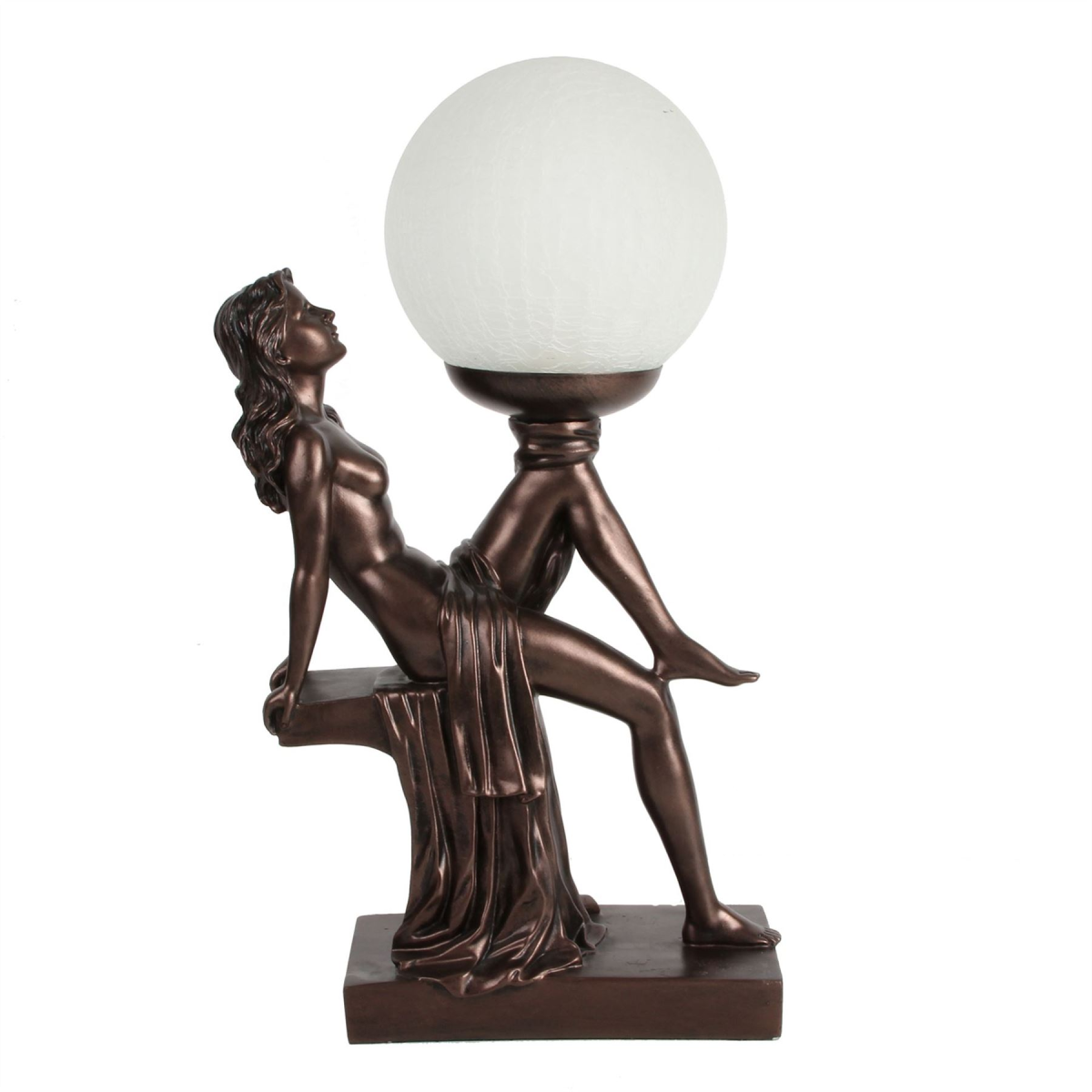 The lamp portrays a sculpted Art Deco style lady holding up a crackled frosted glass globe shade. A stunning decorative item in any home, powered by the included plug with cable on/off switch. Couple with other lamps from the collection to create a unique ambiance.