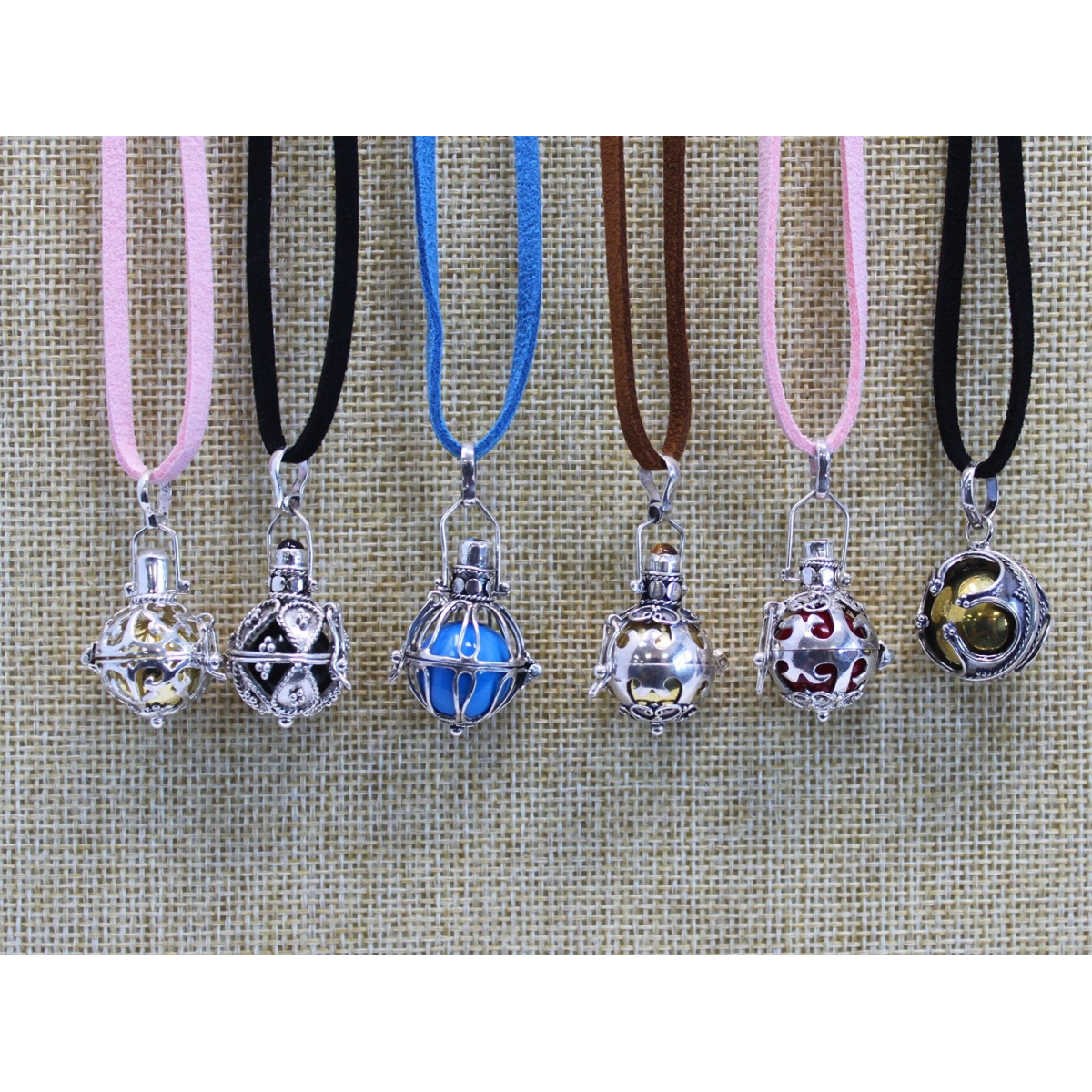 A gift of a silver angel bell, is truly a gift from the heart. Artisan made from Bali 92.5 silver. Neck cords also with silver detail and clasps. Bells are balanced brass or ceramic and resin