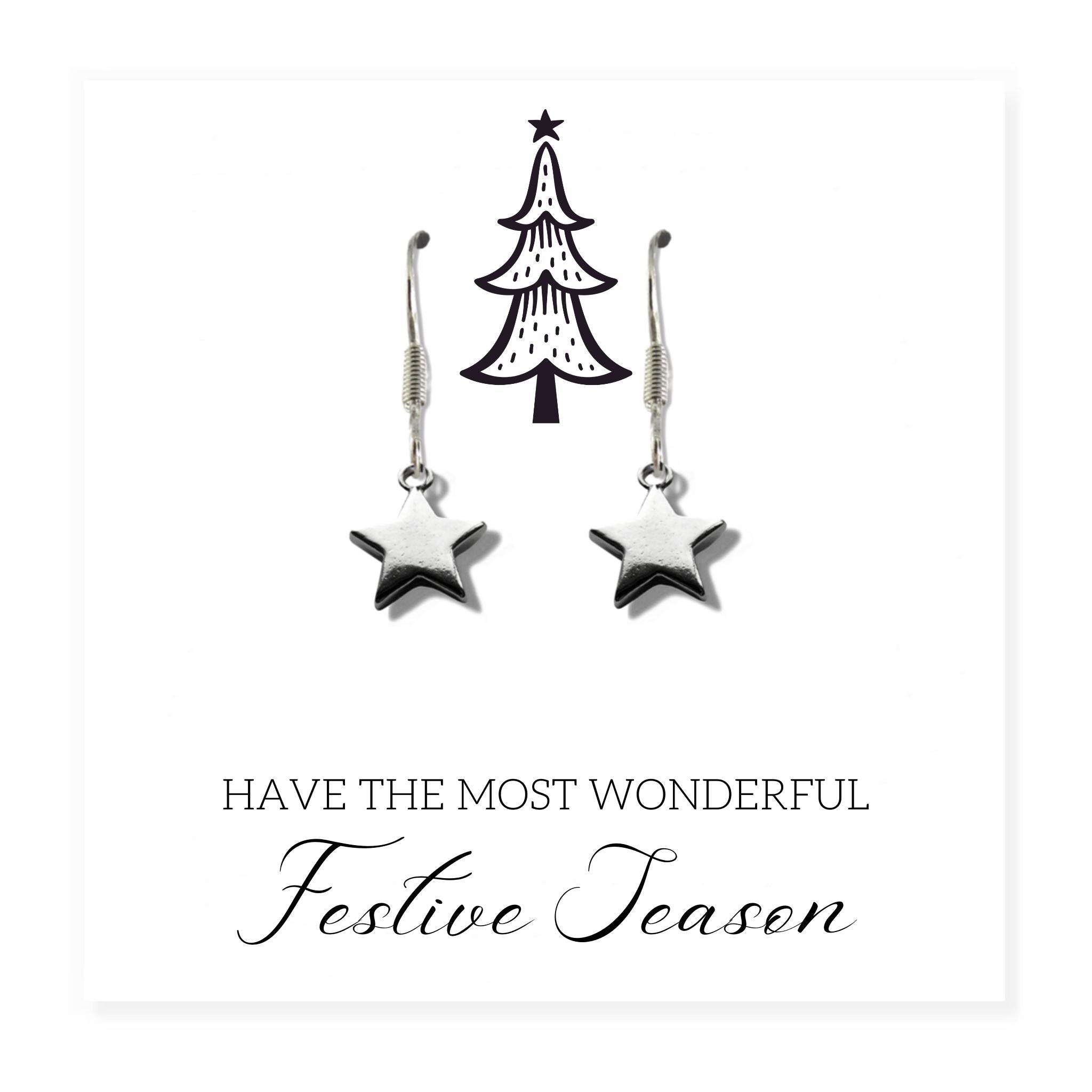 Are you looking for a great Christmas gift? Well we have these lovely silver star earrings that come on a message card with the words "Have the most wonderful. Festive Season". They are sent in a lovely black gift box making this a great Christmas gift for your mum, best friend, auntie, neighbour, secret Santa, sister and are a great idea for teachers too. The card has a small space for you write a little note or can be left blank.