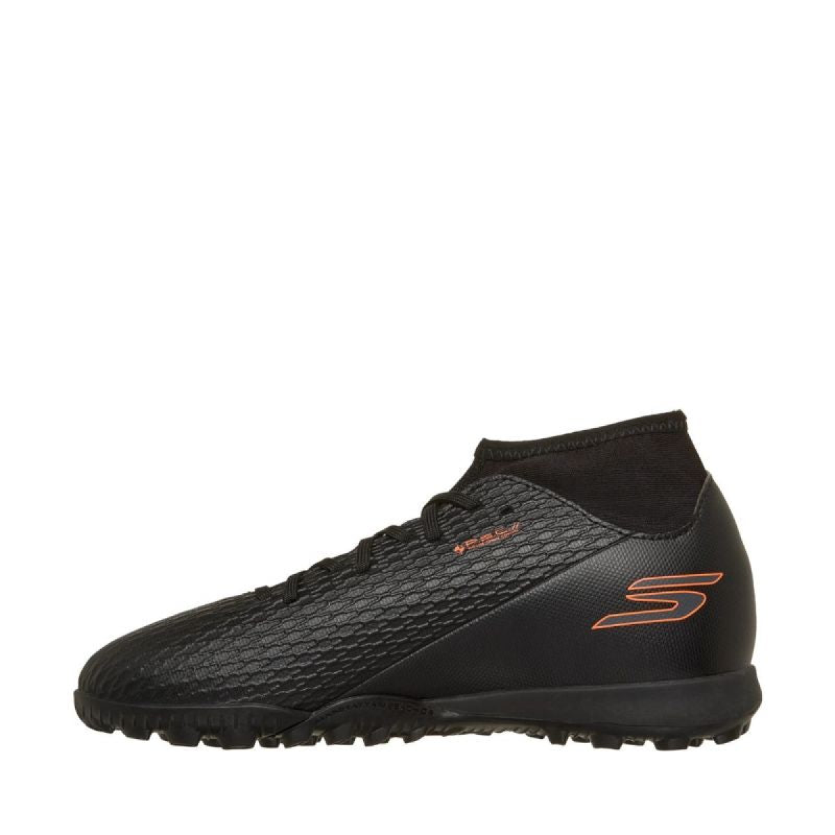 Skechers SKX_2 Kids' Soccer Shoes Black and Orange 252166L. These Skechers boys' soccer shoes are designed for play on artificial turf surfaces. They feature a high-profile synthetic leather upper. A Performance Textile Cuff collar provides enhanced stability during movement. Classic lacing. Textured overlays. Textile lining and EVA sockliner. Rubber outsole.