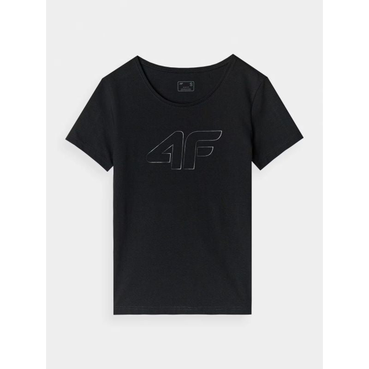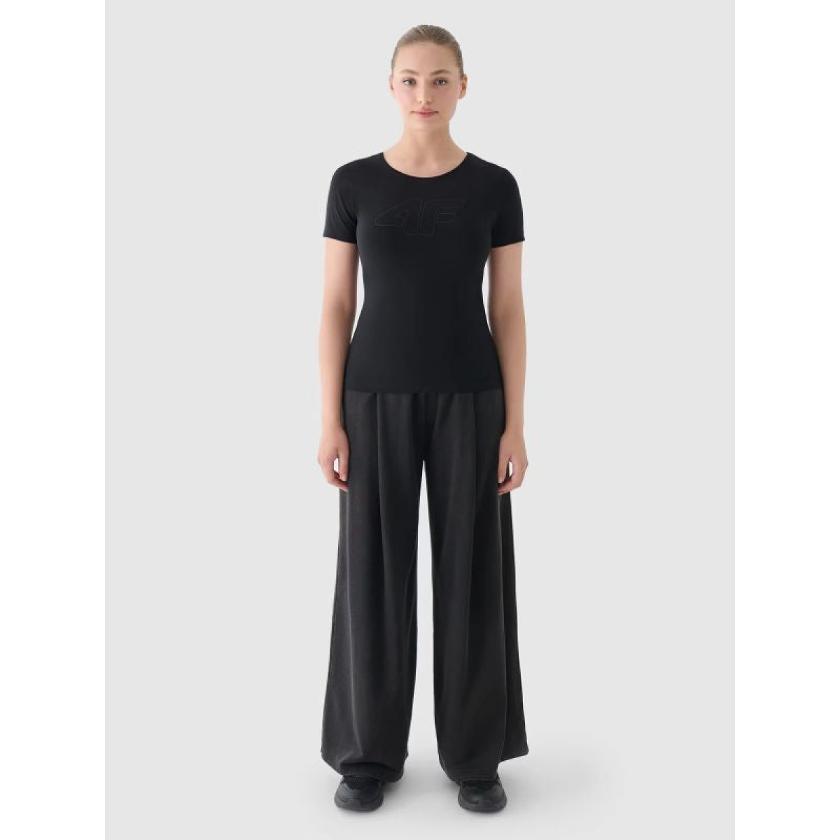 This women's printed T-shirt , with its 180 gsm weight, is soft to the touch and drapes well. It's non-sheer and provides durability and comfort for year-round wear. The 4F women's T-shirt is made of 95% cotton, making it soft, durable, and pleasant to the touch. Thanks to the addition of 5% elastane, it's stretchy and fits comfortably. The crew neckline is finished with a subtle ribbed trim. The "4F" print is visible on the front.