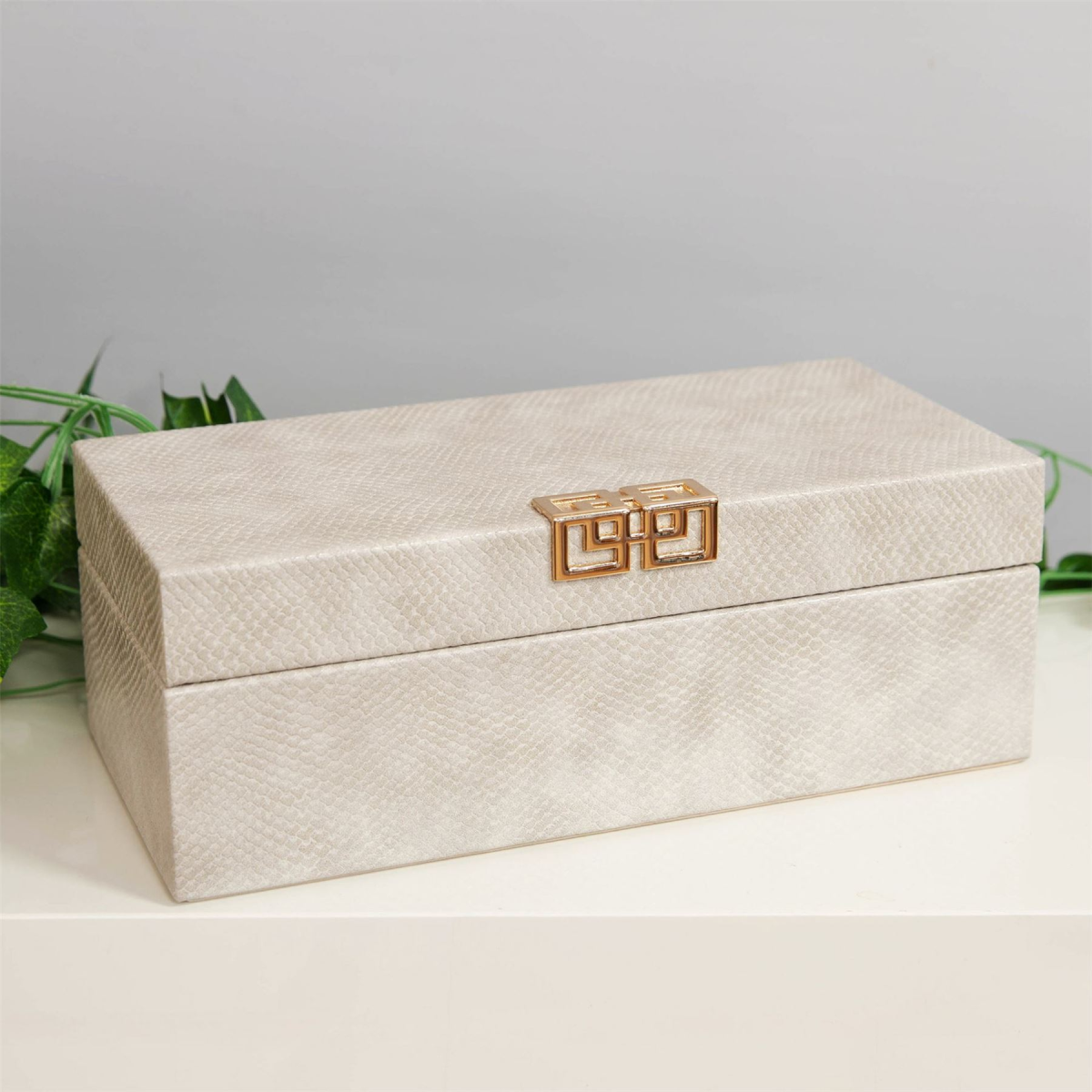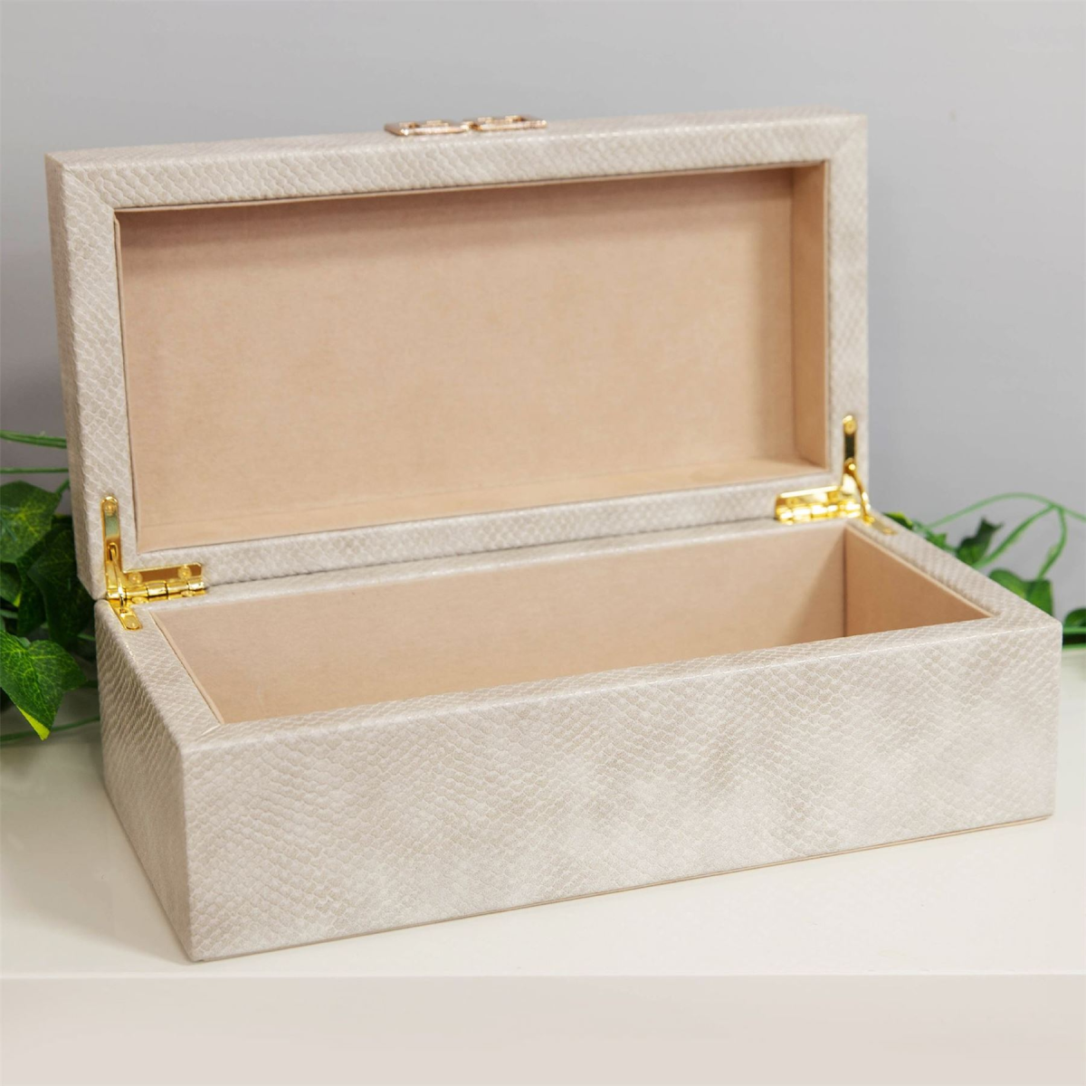 A beautiful faux cream snakeskin jewellery box with gold metal hardware and fabric lining. From the Refined Glamour collection by HESTIA� - a perfect fusion of Art Deco radiance and that signature HESTIA� elegance.