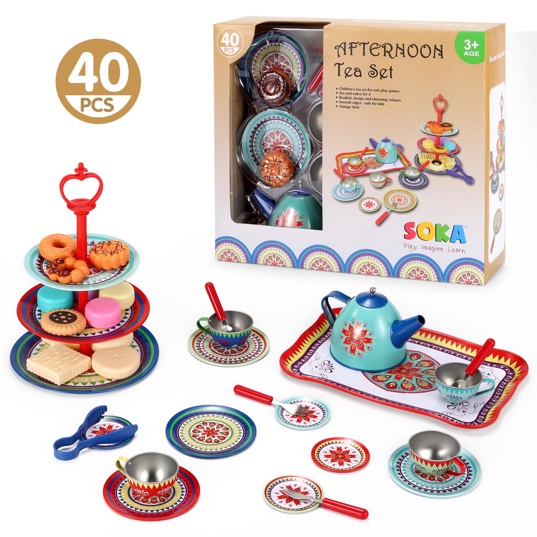 CLASSIC TEA SET FOR KIDS: SOKA Vintage style afternoon tea set is an ideal toy for role play games. Kid’s can throw an evening tea party with friends or enjoy a tea session with teddies in pretend play games. REALISTIC DESIGN: This charmingly colourful t