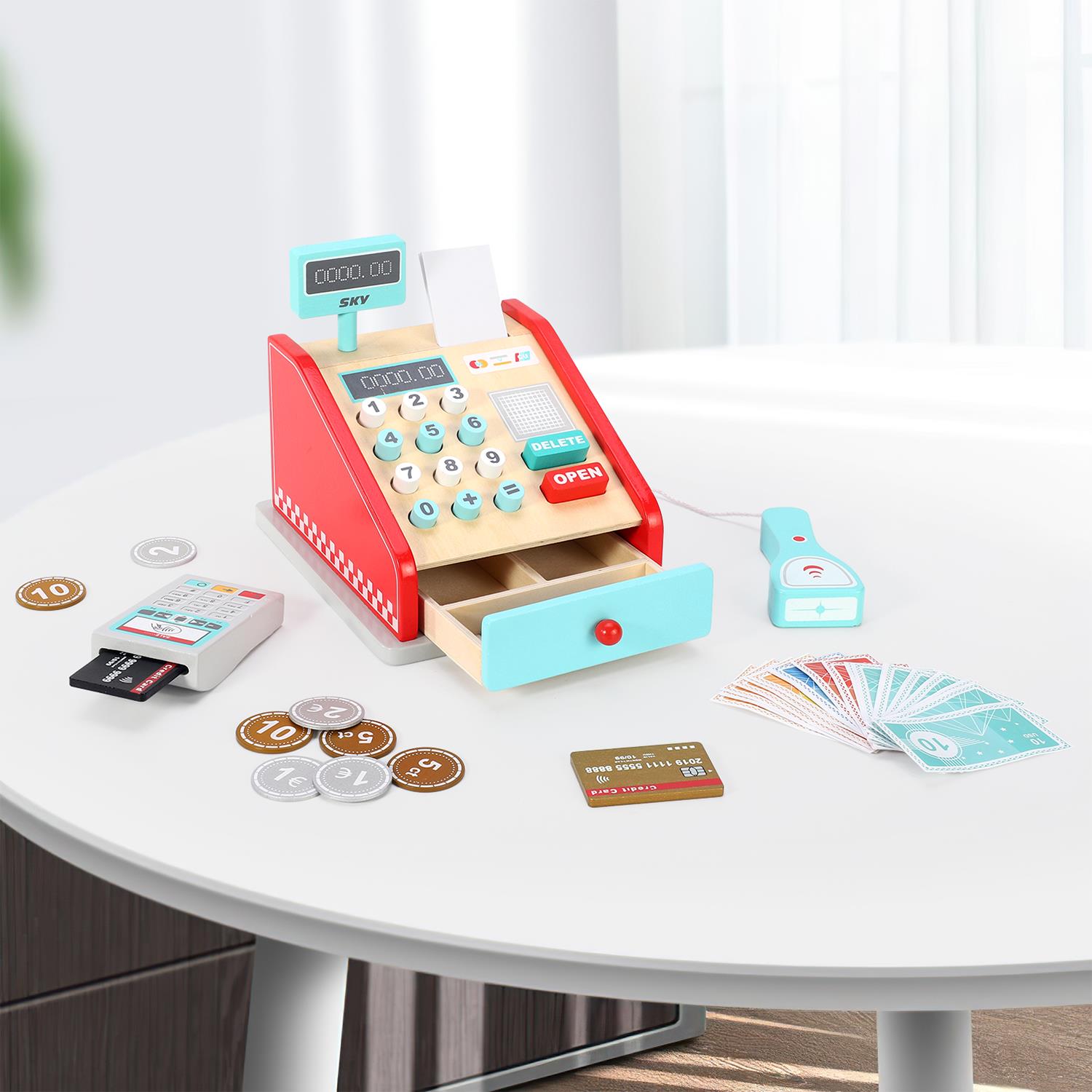 CHECK OUT AND PAY: With our wooden cash register, both children and adults can pay with cash or swipe with a credit card. This playset has realistic accessories that convey lifelike reality, giving your tiny cashiers a more authentic game experience.