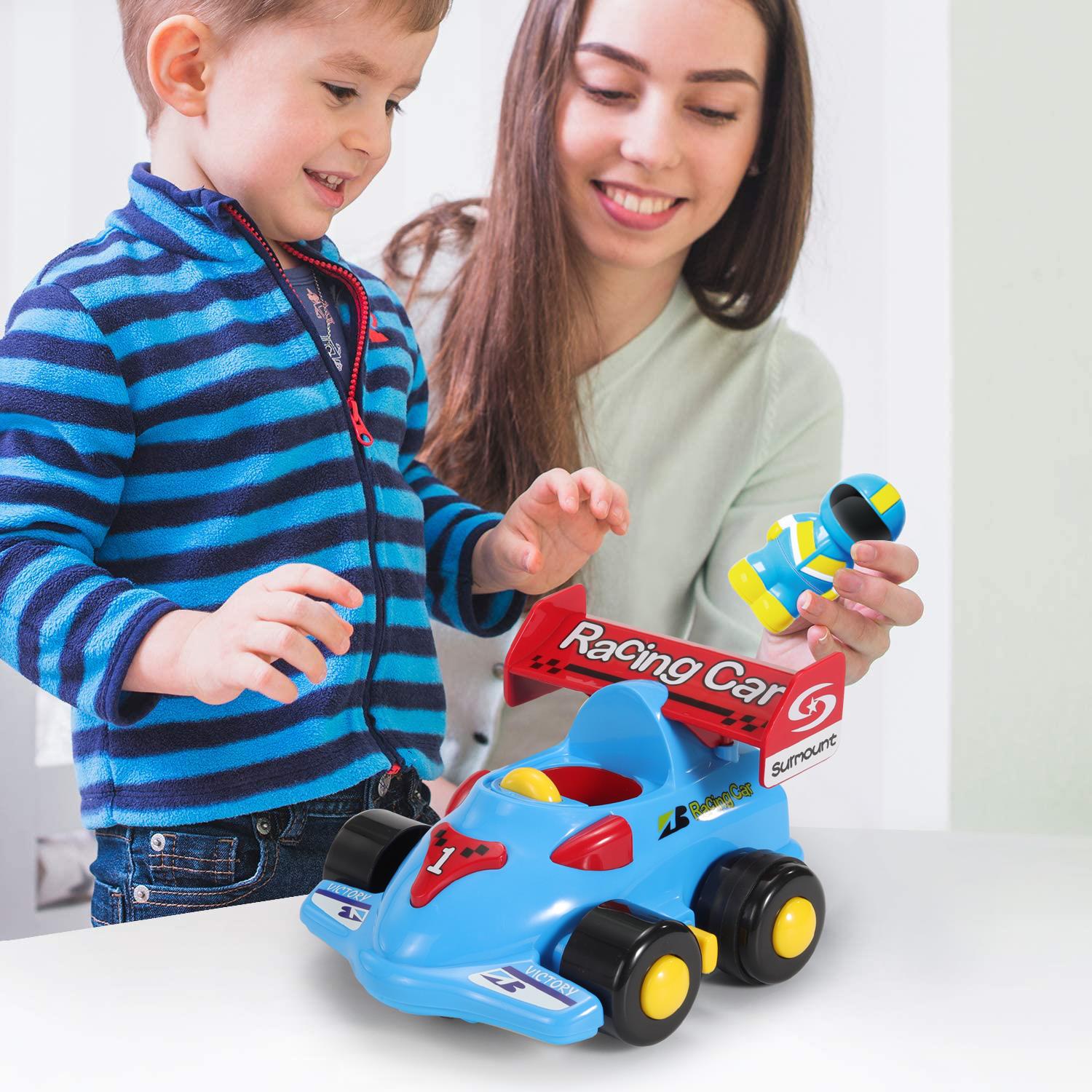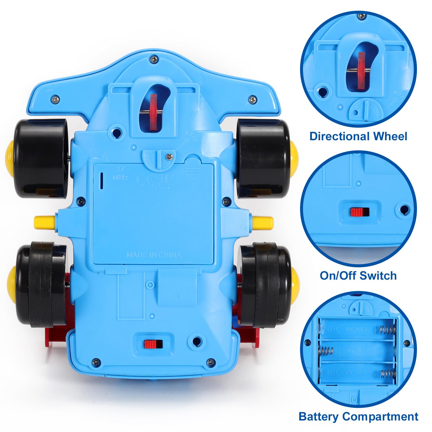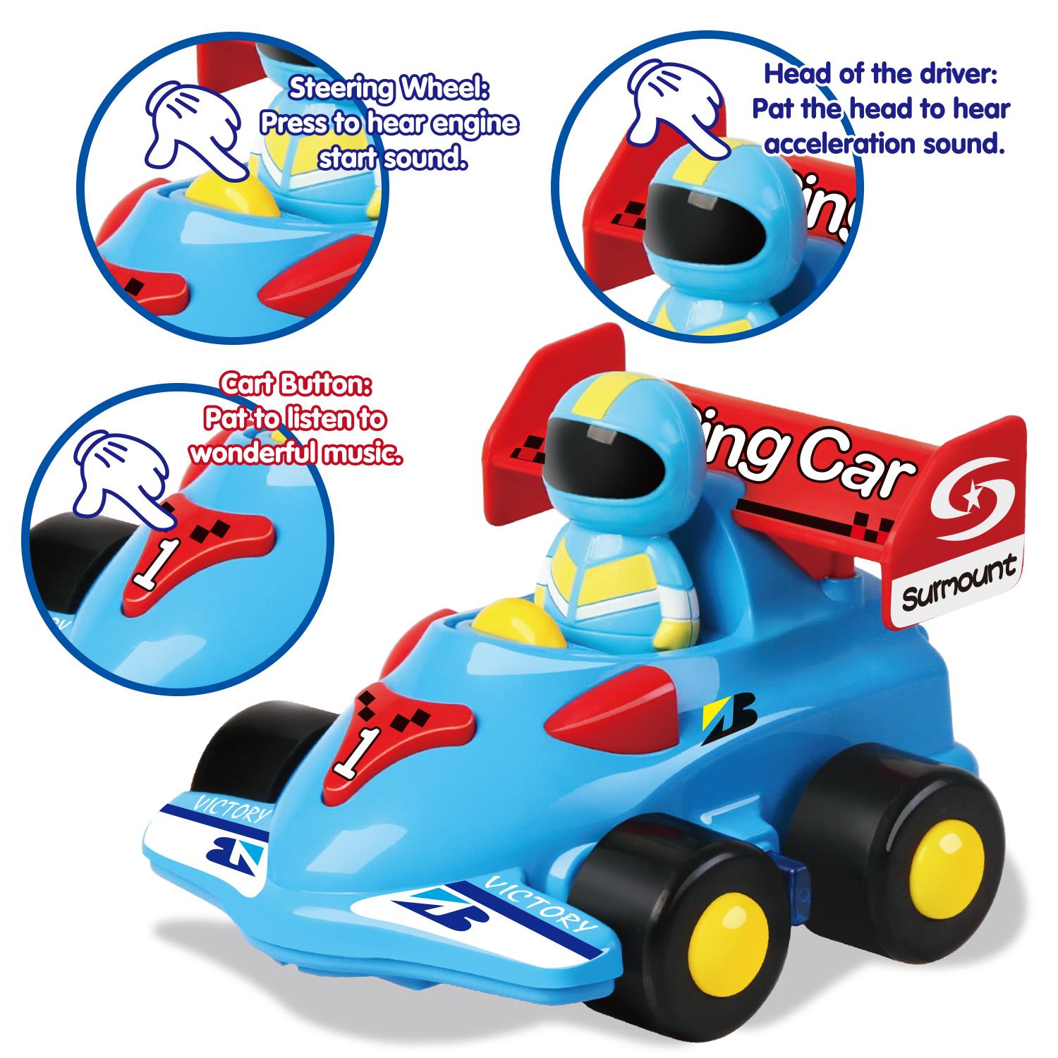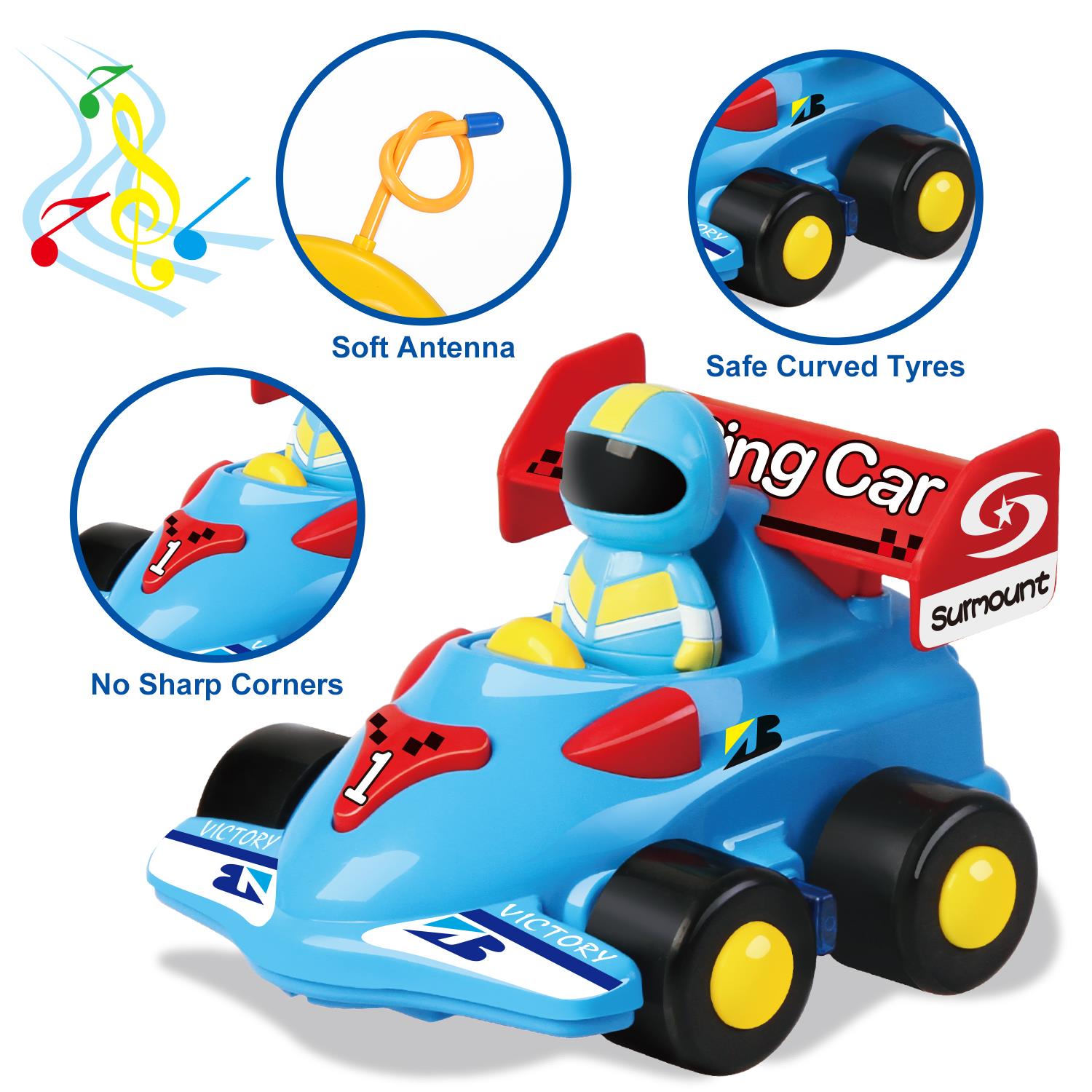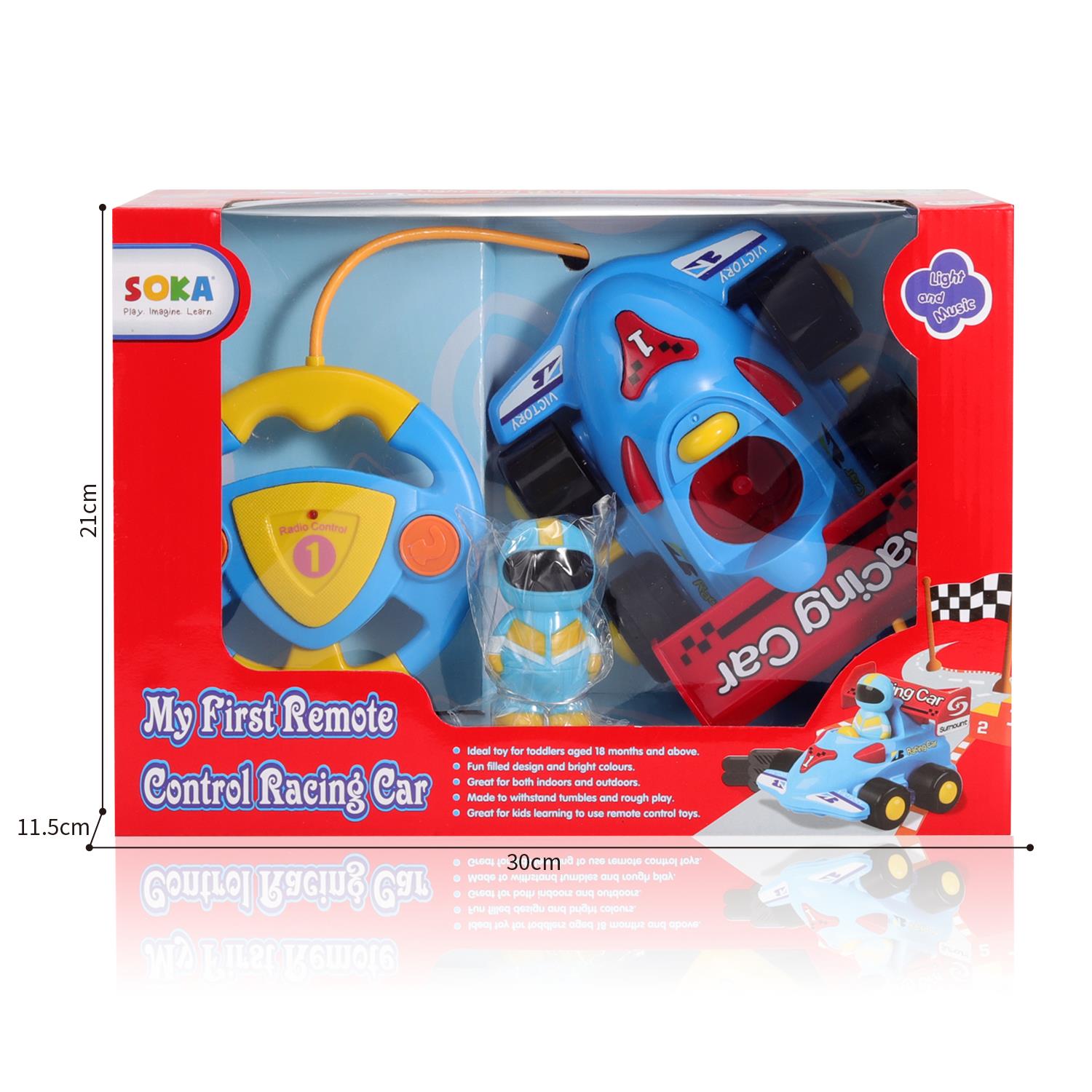 MY FIRST REMOTE CONTROL RACING CAR: Vroom! Vroom! On your mark, get set and race with the SOKA My First Remote Controlled Racing Car. This car is bright and colorful, perfect for young children learning to play RC racing car for the first time. Toddler can easily operate it driving forward and reverse/left. COOL LIGHTING AND MUSIC: Press the button on the body and the car, it will cause interesting sounds and bright lights to attract toddler’s attention. Toddlers will exercise the development of sound discrimination ability and flexibility of fingers via playing this cartoon. REMOVABLE CAR DRIVER: Features a cute removable race car driver figure that kids can place in the car or take out to play with. Cute and stylish, this remote control sports car is a great introduction to remote control toys for young children and toddlers. DESIGN: Non-toxic ABS plastic construction with soft edges as well as soft remote antenna for safety and injury prevention. Suitable for ages 18 months and over. Requires 5 x AA Batteries required (Not Included). Product Dimension Car: 17 x 15 x 11 cm Controller: 12 x 2 cm approx IDEAL GIFT: Be it a birthday, Christmas or any other occasion you cannot go wrong with this item when it comes to gifting a young child.