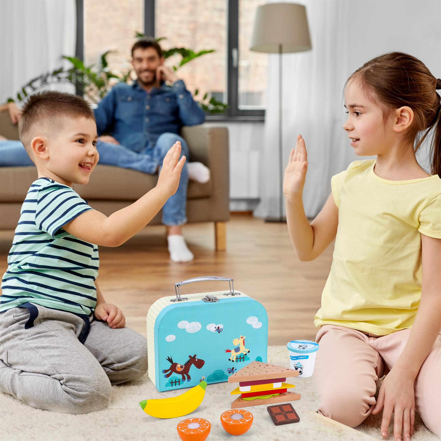 CARRY LUNCH BOX: Let the kids pretend they are in school and have a good time with our charming classic toy lunch box including 1 yogurt, 1 banana, 1 cheese slice, 1 half a slice egg, half a slice tomato, half a slice salami, 2 slice bread, 2 half of orange, 1 chocolate and 1 leaf. All pieces are presented in a beautifully designed wooden lunch box that measures approximately 7 x 14 x 19 cm.