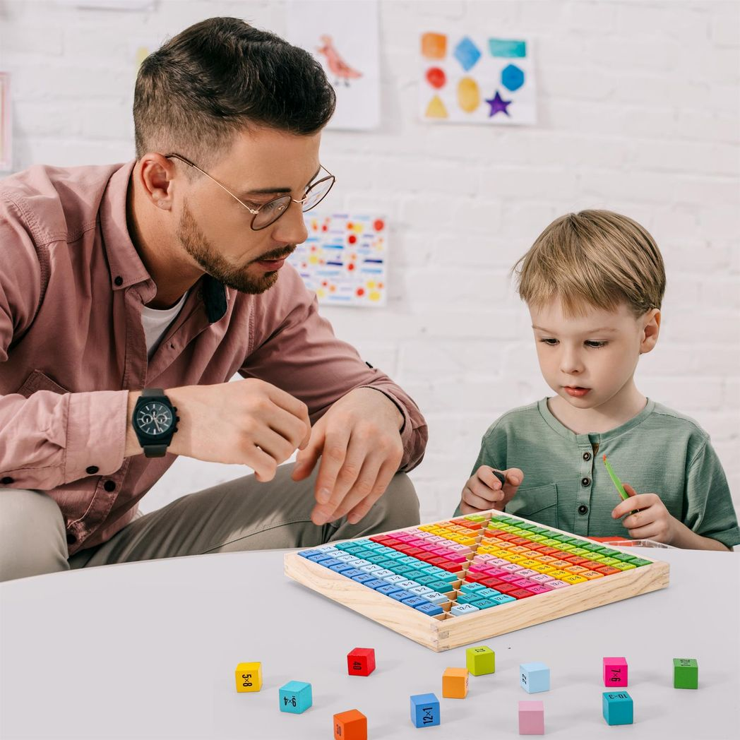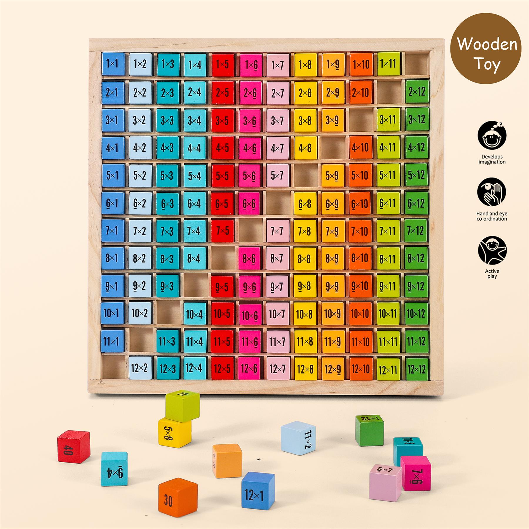 TWO-SIDES DESIGN: Set includes 144 colourful blocks with 1 to 12 times tables printed on one side and the answer on the other side. All pieces are presented in a beautifully grid designed wooden tray.