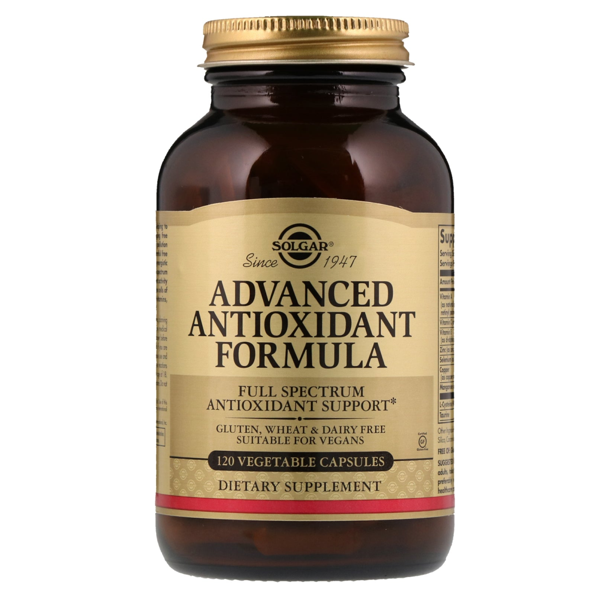 Since 1947 Full Spectrum Antioxidant Support Gluten, Wheat & Dairy Free Suitable For Vegans Dietary Supplement Antioxidants play a major role in helping to fight against destructive, cell damaging free radicals in the body. Environmental pollution may also play a role in producing harmful free radicals. Solgar's proprietary and synergistic formulation provides a full and broad spectrum of ingredients that promote antioxidant activity and provide antioxidant, vitamins, minerals, Pcynogenol and green tea.