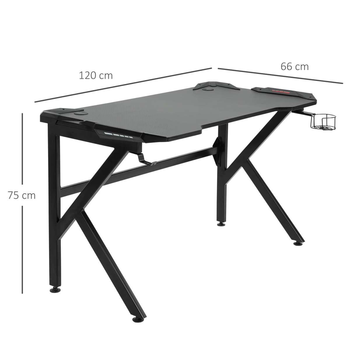 Robust structure: Steel 'K'shaped frame provides unrivalled balance for this computer desk, with a back bar for extra support. Particle board table top is solid, with a smooth finish and bulky corners for extra protection.Large table top: Generous 120x60cm, the PC desk for gaming gives plenty of room for you to game with your equipment properly spaced out on.Useful features: The gamer desk comes with headphone hook, cup holder and cable management to keep mess to a minimum and keeping your home tidy and clean.Anti-slip feet: Keeps the gaming PC desk stable at all times. Dimensions: 75H x 120L x 66Wcm.Maximum load 30kg, assembly required.