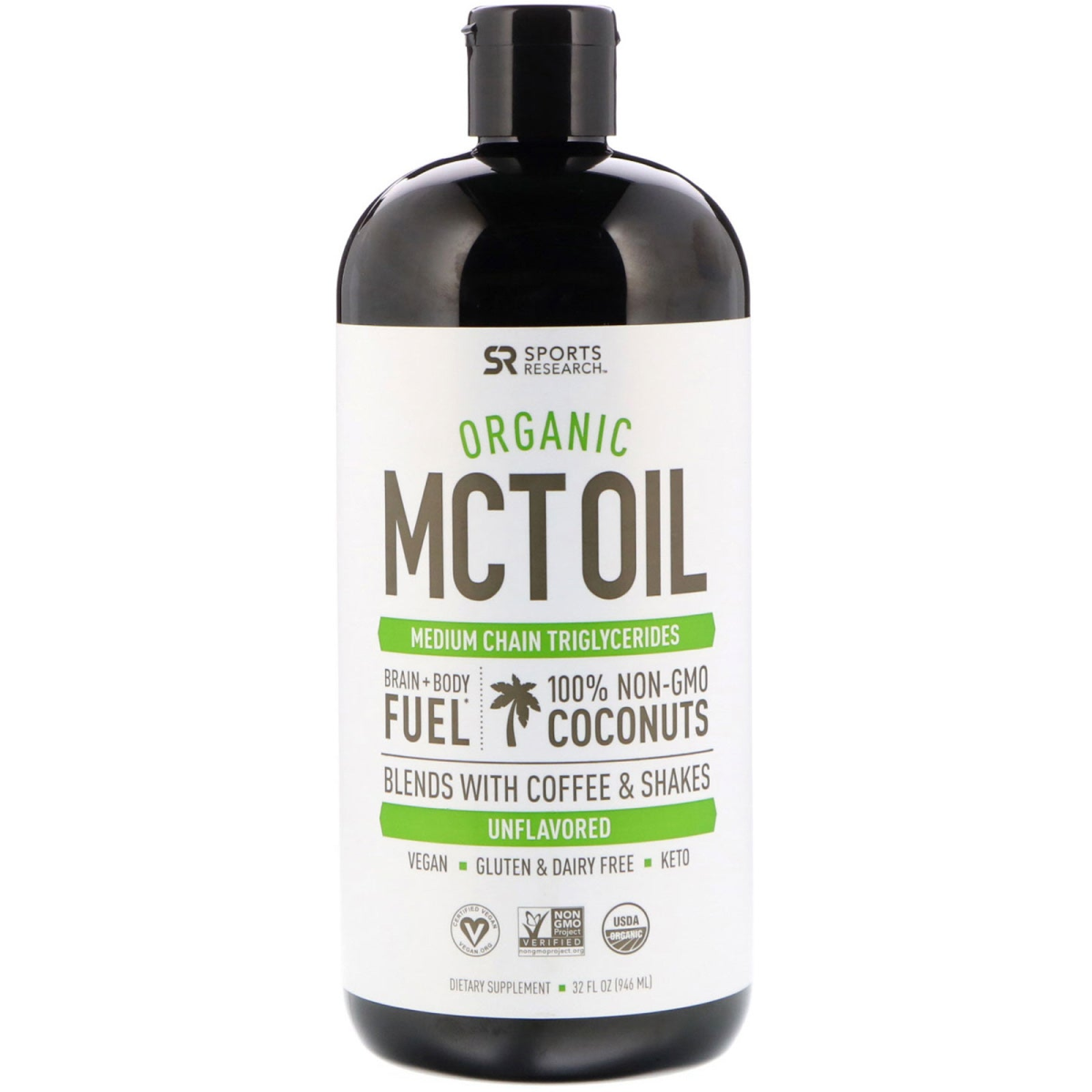 Medium Chain Triglycerides Brain + Body Fuel 100% Non-GMO Coconuts Blends with Coffee & Shakes Vegan Gluten & Dairy Free Dietary Supplement BPA Free Certified by QAI Sports Research MCT Oil is proudly certified. Non GMO Project Certified Certified Vegan Keto Friendly Certified Paleo Sports Research USDA Certified MCT Oil is derived only from cold-pressed Coconuts without the use of chemicals, GMOs or hexane. Medium-Chain Triglycerides [MCTs] are rapidly absorbed and changed into ketone bodies, providing a reliable and quick source of energy from fat, not sugar. SR MCT Oil is comprised of both Caprylic [C8] and Capric [C10] fatty acids, and can be easily added to any food or drink without altering taste.