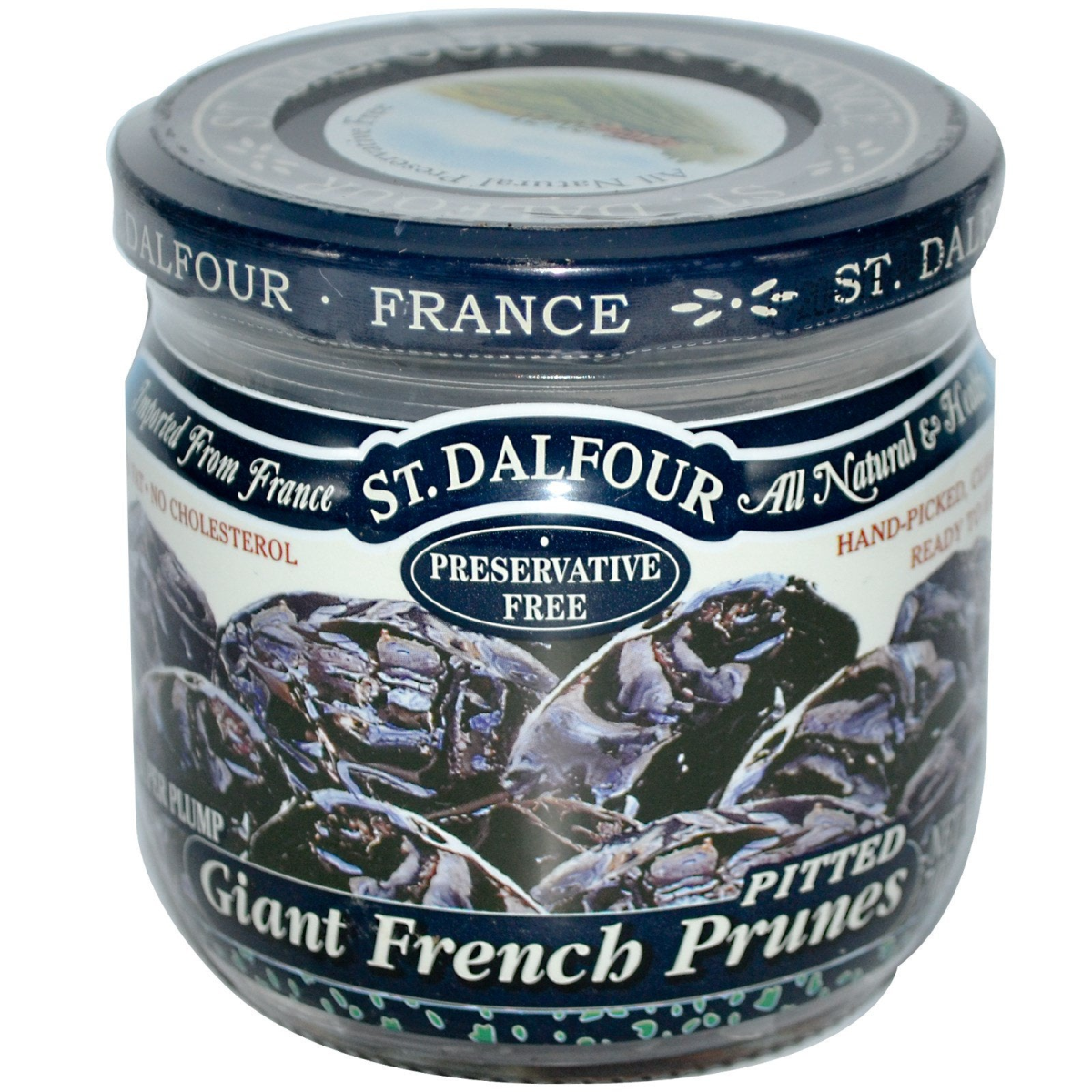 All Natural Preservative Free Imported from France All Natural & Healthy No Fat No Cholesterol Preservative Free Hand-Picked, Clean, Ready to Eat Super Plump Optimal Food Process These fancy prunes are made from plums grown in the Agen region of France. The climate and terrain act in harmony to create plums of extraordinary quality. They are made into prunes without preservatives using a special all natural, patented deep vacuum method. The pits are then removed. St. Dalfour keeps the tender, plump quality of the prunes. They are not dry or hard, they are succulent. They are the best pitted prunes in the world. Packed in France with Prunes from Agen, France