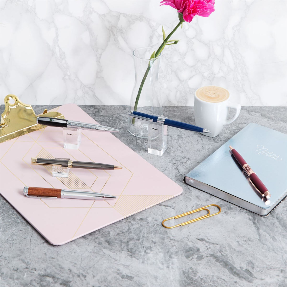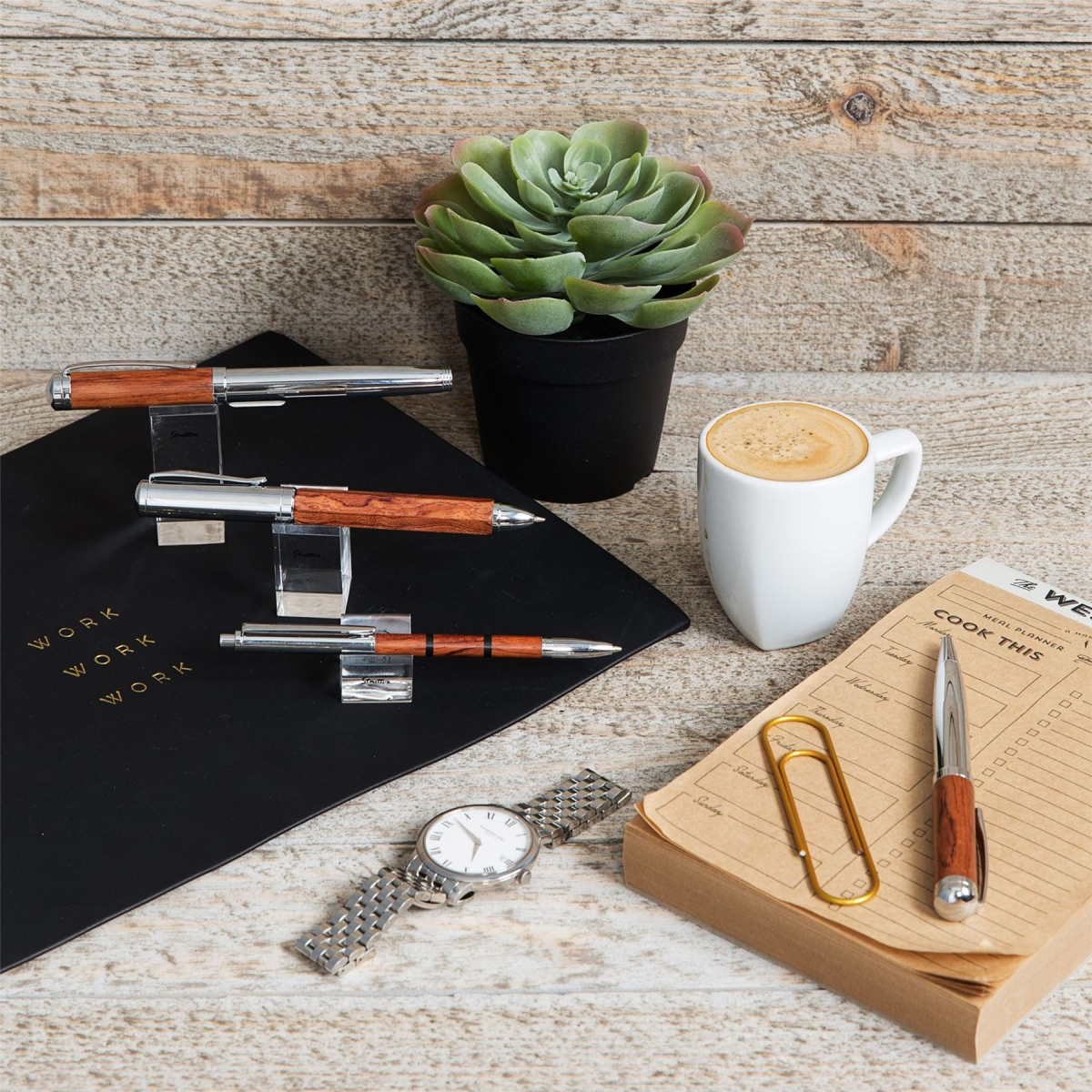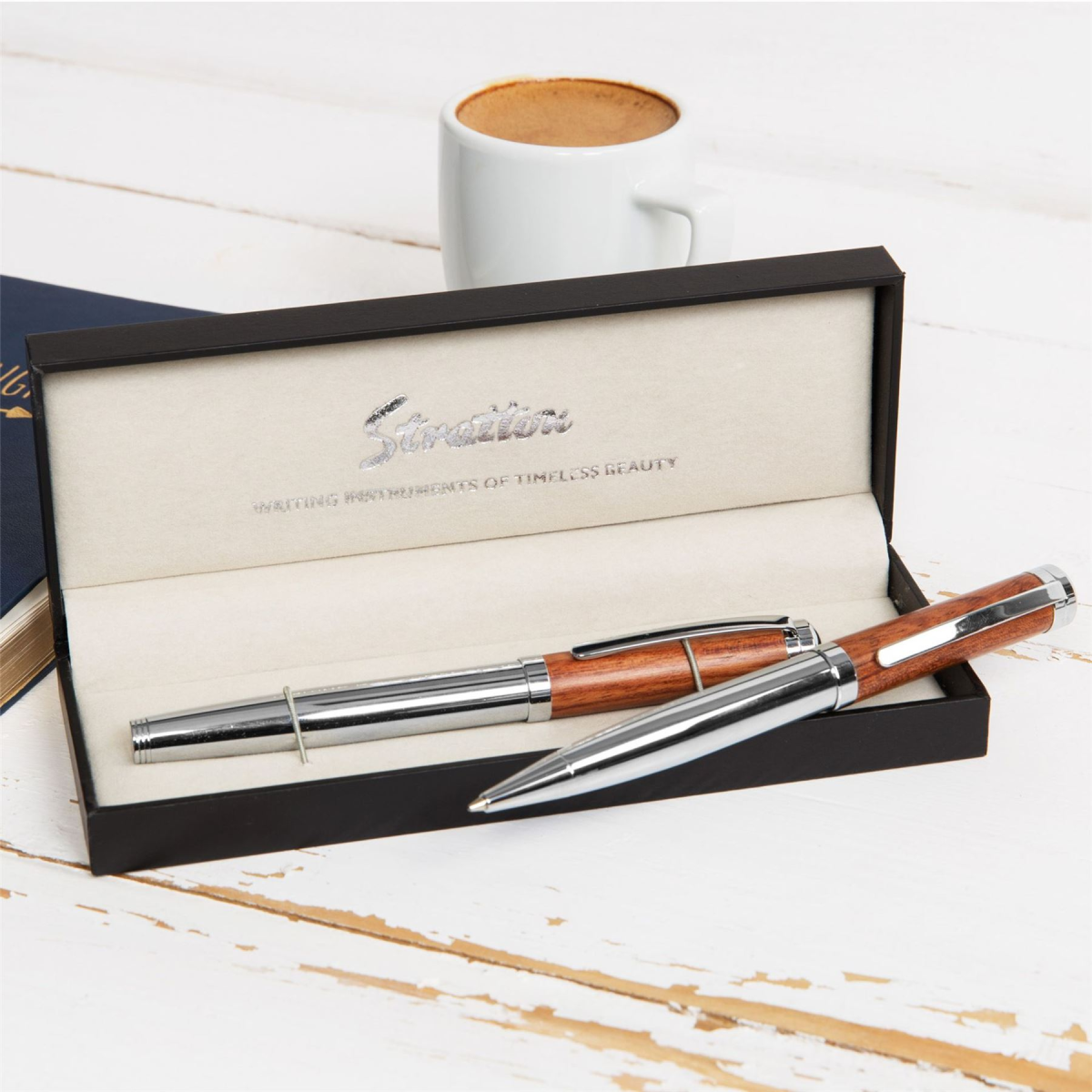 An elegant and distinguished pen set featuring a rollerball and ball point pen. Features a cherry wood and chrome finish barrel with pocket clip. Complete with grey velveteen lined, faux leather gift box with silver embossed Stratton logo and patent fountain pen nib detail. The perfect gift for a discerning professional.