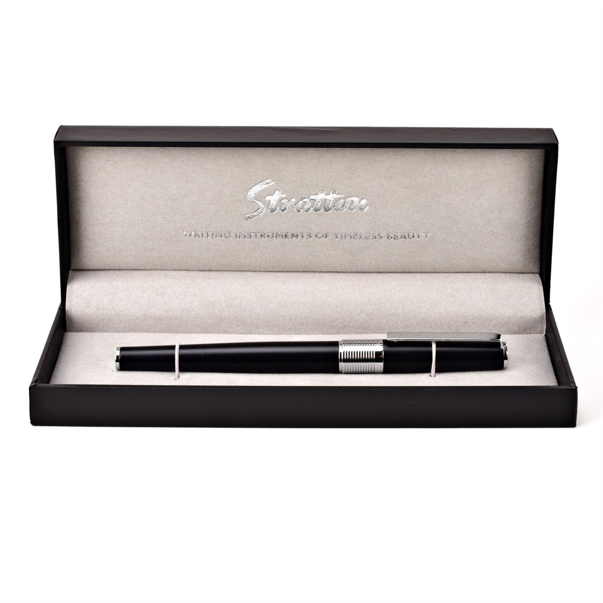 A stylish matt black and chrome finish metal lidded rollerball pen. From Stratton Pens - 120 years of prestige, a lifetime of precision.