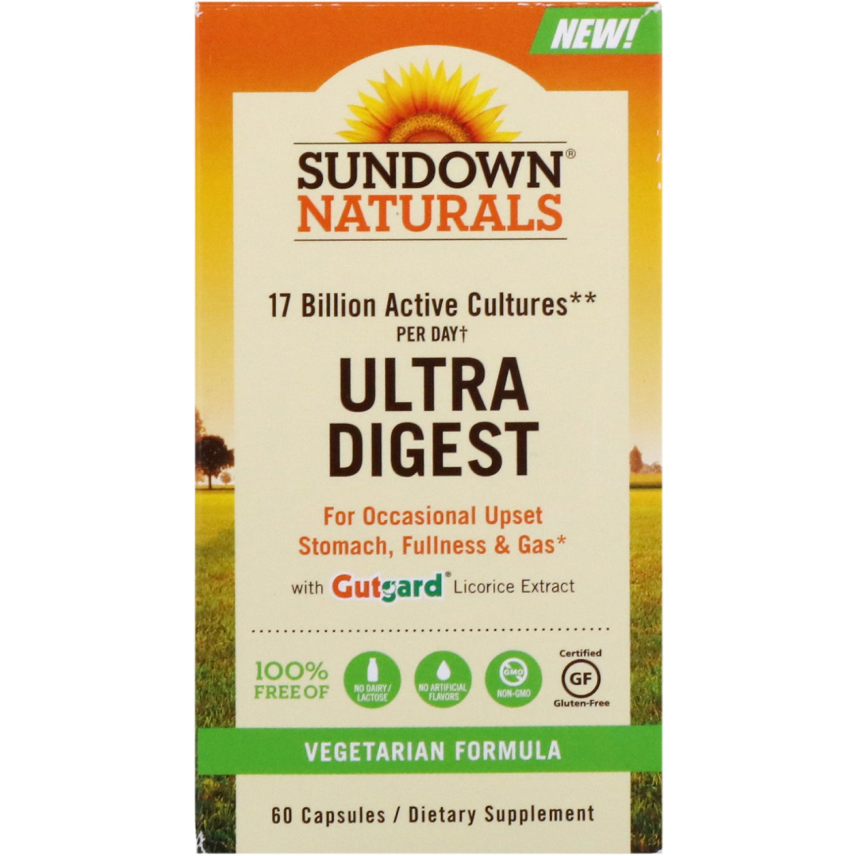 17 Billion Active Cultures** Per Day†For Occasional Upset Stomach, Fullness & Gas with Gutgard Licorice Extract Vegetarian Formula Dietary Supplement 100% Free Of: No Dairy / Lactose No Artificial Flavors Non-GMO Certified Gluten-Free Sundown Naturals Ultra Digest gives you digestive support when and where you need it! This multi-faceted formula contains three key ingredients for comprehensive digestive support. GutGard contains deglycyrrhizinated licorice (DGL), that starts working in the stomach to relieve occasional sour stomach, heartburn and fullness. The enzyme α-galactosidase helps break down carbohydrates in the small intestines to reduce the production of gas, while a blend of probiotics support digestive health by contributing to the healthy gut flora in the large intestines. Support upper, mid and lower gastrointestinal health with Ultra Digest. Smart Facts No artificial colors No preservatives GutGard helps with occasional heartburn & sour stomach Supports upper, mid & lower GI health **At time of manufacture †When being used as directed