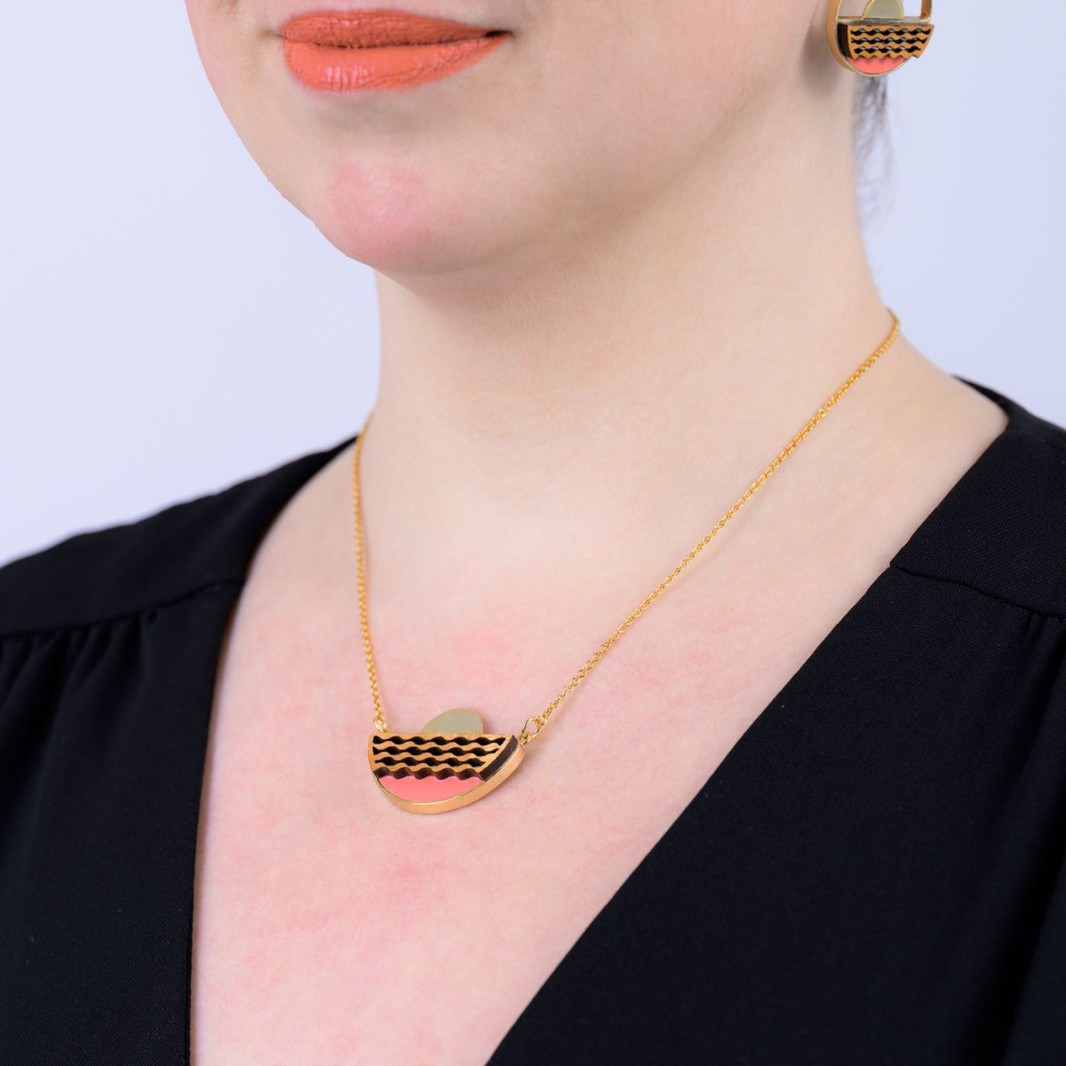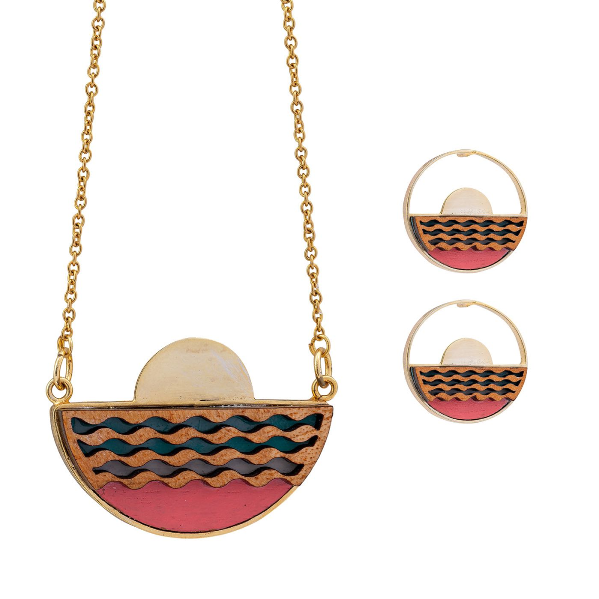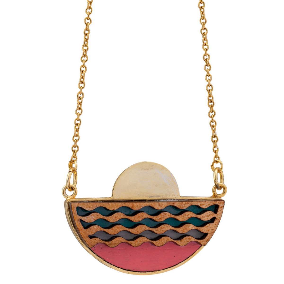 Our Sunset Recycled Wood Gold Necklace are handmade using offcuts of mahogany that are salvaged from furniture factories. This upcycled necklace is elegant, simple and lightweight. Each piece is unique and no two necklaces will ever be quite the same.