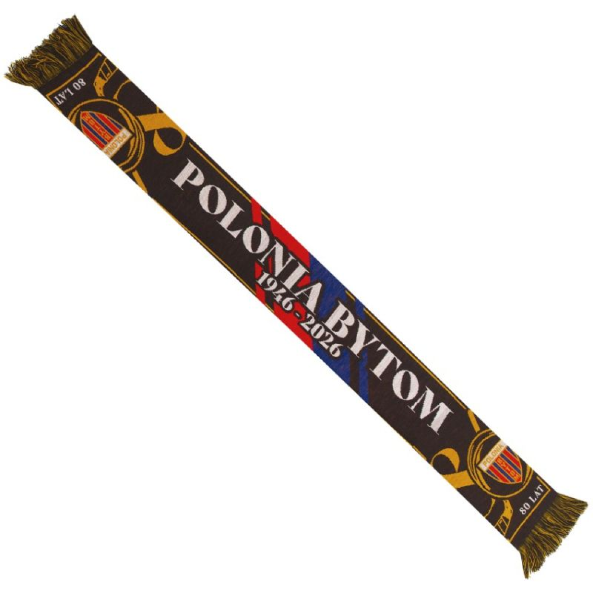 Polonia Bytom Scarf – 80 Years of Hockey. A jubilee symbol of pride and tradition. The Polonia Bytom Scarf – 80 Years of Hockey is a unique accessory created to celebrate the club's anniversary, highlighting its rich history and sporting heritage. Its elegant design with anniversary motifs, the Polonia Bytom coat of arms, and the inscription "80 YEARS" make the scarf not only a practical wardrobe item but also a valuable souvenir for every fan. Carefully selected colors and expressive details give it a prestigious character. Key features: Anniversary Edition: A design commemorating 80 years of Polonia Bytom's hockey history. Club emblems: The team coat of arms and anniversary graphics emphasize the commitment to tradition. Stylish, collectible design: The combination of classic colors with modern graphic elements creates a timeless look. Comfortable material: Soft fabric ensures warmth and comfort during matches and everyday wear. The Polonia Bytom – 80 Years of Hockey scarf is a unique souvenir that allows you to proudly celebrate the club's history and support it every season.