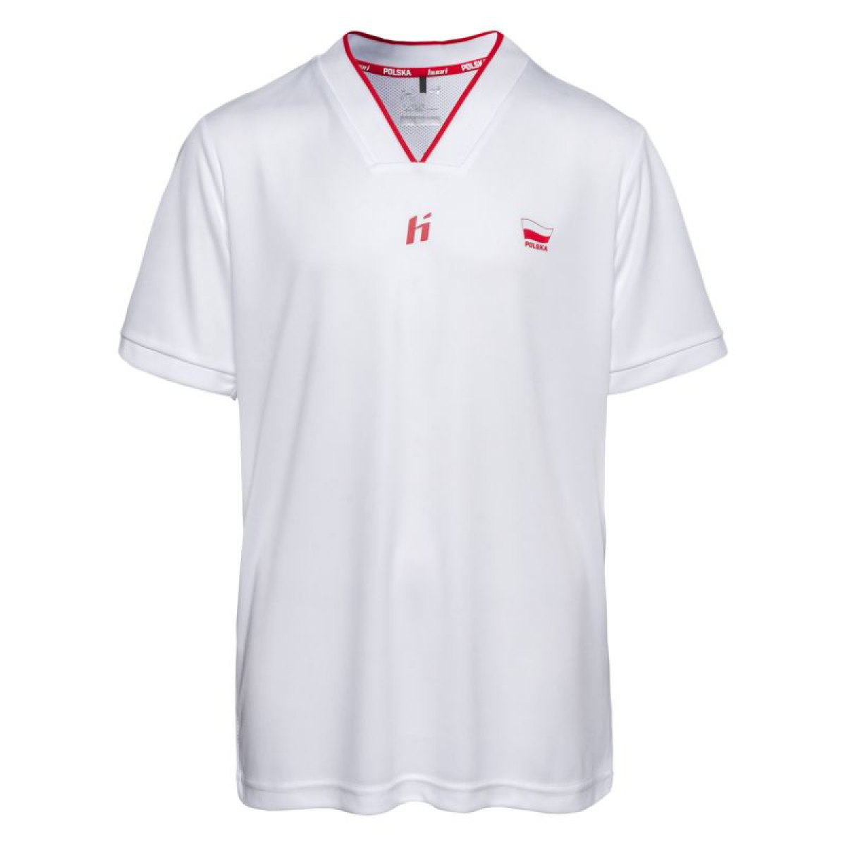The ALUMNI POLAND JUNIOR children's T-shirt by Huari has a simple cut with a V-neck. It is made of synthetic material, the advantage of which is to efficiently wick sweat away from the skin. The back of the T-shirt has a structure made of a thousand small holes that help transport moisture to the outside. The whole is complemented by the inscription "Polska" on the back and the Polish flag on the chest.