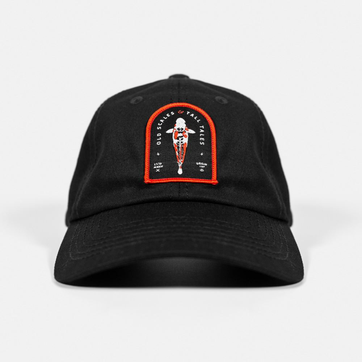 Unstructured 6 panel baseball cap featuring our iconic 'Tall Tales' artwork in a merrow-bordered woven patch. Fully adjustable rear strap with antique brass adjuster. One size fits all.
