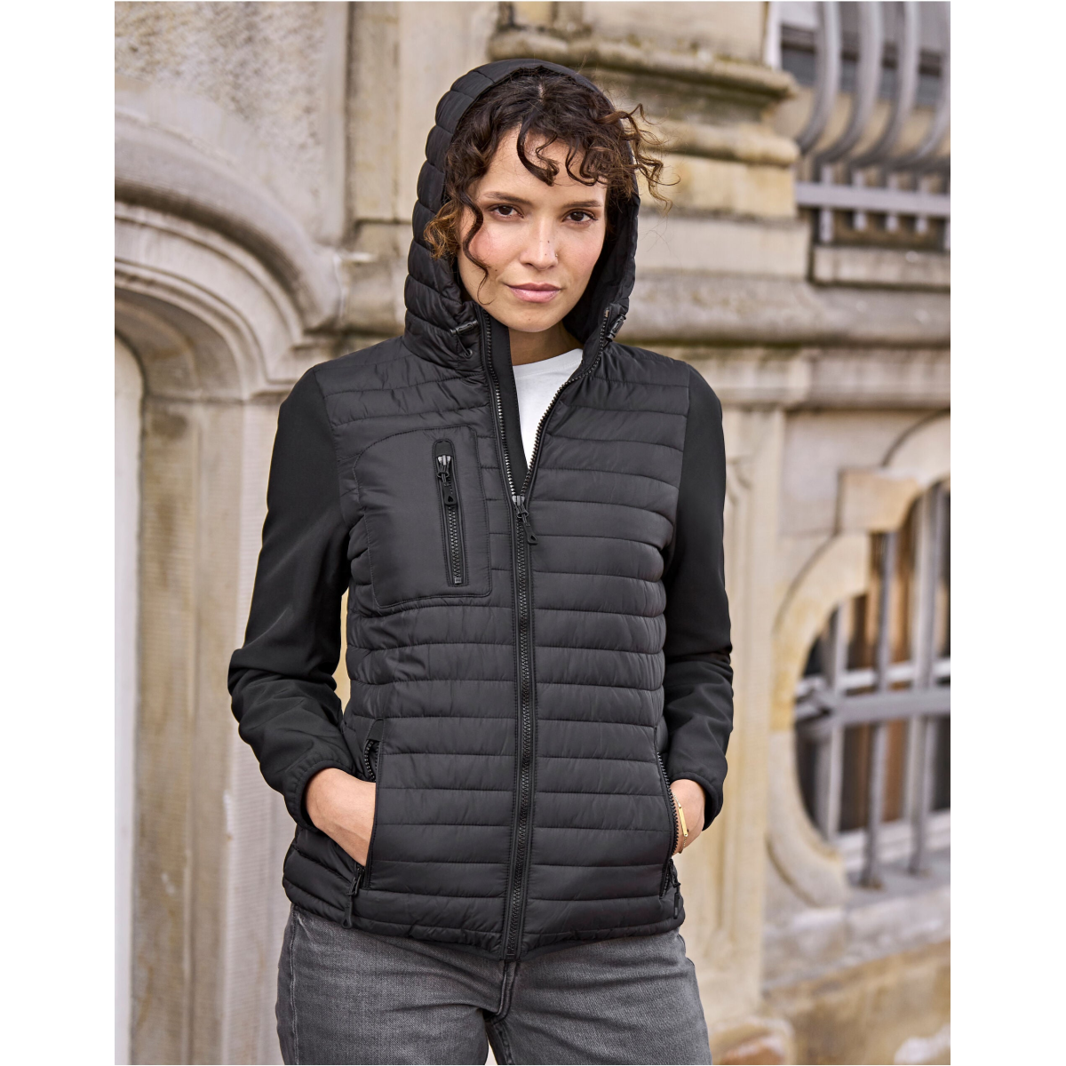 Tee Jays Ladies Hooded Crossover Jacket | Showerproof Puffer | Softshell Panels | Black | S-3XL