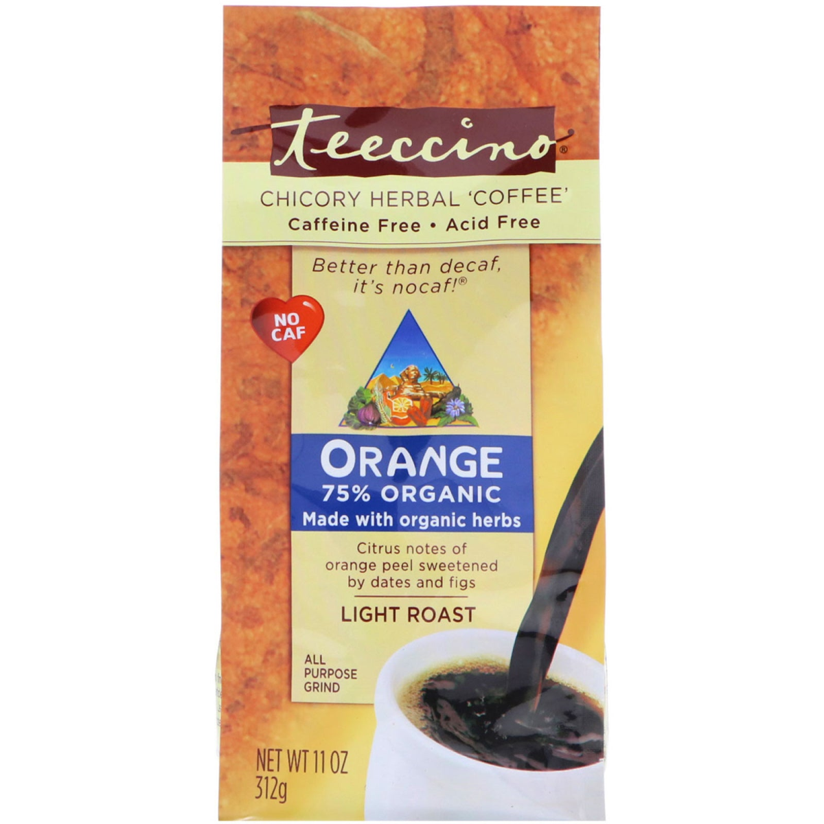 Acid Free Better than Decaf, It's Nocaf! 75% Organic Made with Organic Herbs Citrus Notes of Orange Peel Sweetened by Dates and Figs All Purpose Grind Certified Organic by Quality Assurance International QAI Kosher Parve There's no milk in soy milk and no coffee in herbal coffee! Enjoy Teeccino's deliciously rich, deep-roasted flavor that delivers all the satisfaction without the caffeine and acidity of coffee! Discover why Teeccino fans describe it as smoother, richer, and creamier than coffee. The secret? French chicory, the roasted root often added to coffee, blended with barley, Italy's favorite caffeine-free roasted brew, and Spanish carob, famed for its chocolaty flavor. Enriched with California's almonds, dates, and figs, a cup of Teeccino brims with many health benefits: 100% naturally caffeine free - better than decaf. Acid Free - helps restore alkaline balance. Natural energy boost - from nutrients, not stimulants. Heart-healthy potassium - for optimal performance and hydration. Inulin - A prebiotic soluble fiber that feeds your gut flora to improve digestion, elimination, and support the immune system! Enjoy Teeccino Many Ways Blend with coffee to reduce caffeine & acidity. For an energy pick-up and low-calorie snack. Delicious dessert beverages that won't interfere with sleep. Nutritious drink for kids too! Beyond Fair Trade: Creating New Trade! Most of Teeccino's ingredients are grown in Europe and the USA. We pioneer new trade for organic chicory with smallholder farmers in India and for wild harvested ramón seeds with rainforest villagers in Central America. These ingredients create economic opportunities where income is scarce. By drinking Teeccino, you join us in supporting families devoted to organic, fair trade values in both developed and emerging countries.
