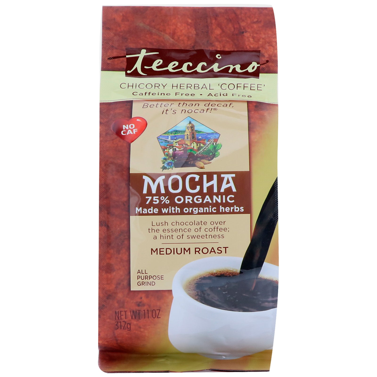 Chicory Herbal 'Coffee' Caffeine Free Acid Free Better Than Decafe, It's Nocaf! No CAF 75% Organic Made with Organic Herbs Lush Chocolate Over the Essence of Coffee; a Hint of Sweetness All Purpose Grind Kosher Parve Certified Organic by QAI There's no milk in soy milk and no coffee in herbal coffee! Enjoy Teeccino's deliciously rich, deep-roasted flavor that delivers all the satisfaction without the caffeine and acidity of coffee! Discover why Teeccino fans describe it as smoother, richer, and creamier than coffee. The secret? French chicory, the roasted root often added to coffee, blended with barley, Italy's favorite caffeine-free roasted brew, and Spanish carob, famed for its chocolaty flavor. Enrich with California's almonds, dates, and figs, a cup of Teeccino brims with many health benefits: 100% naturally caffeine free- better than decafe Acid Free - helps restore alkaline balance Natural energy boost - from nutrients, not stimulants Heart-healthy potassium - for optimal performance and hydration Inulin - A prebiotic soluble fiber that feeds your gut flora to improve digestion, elimination, and support the immune system! Enjoy Teecino Many Ways Blend with coffee to reduce caffeine & acidity For an energy pick-up and low-calorie snack. Delicious dessert beverages that won't interfere with sleep. Nutritious drink for kids too!
