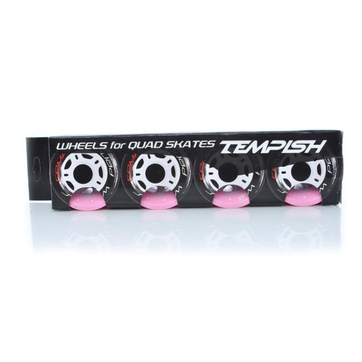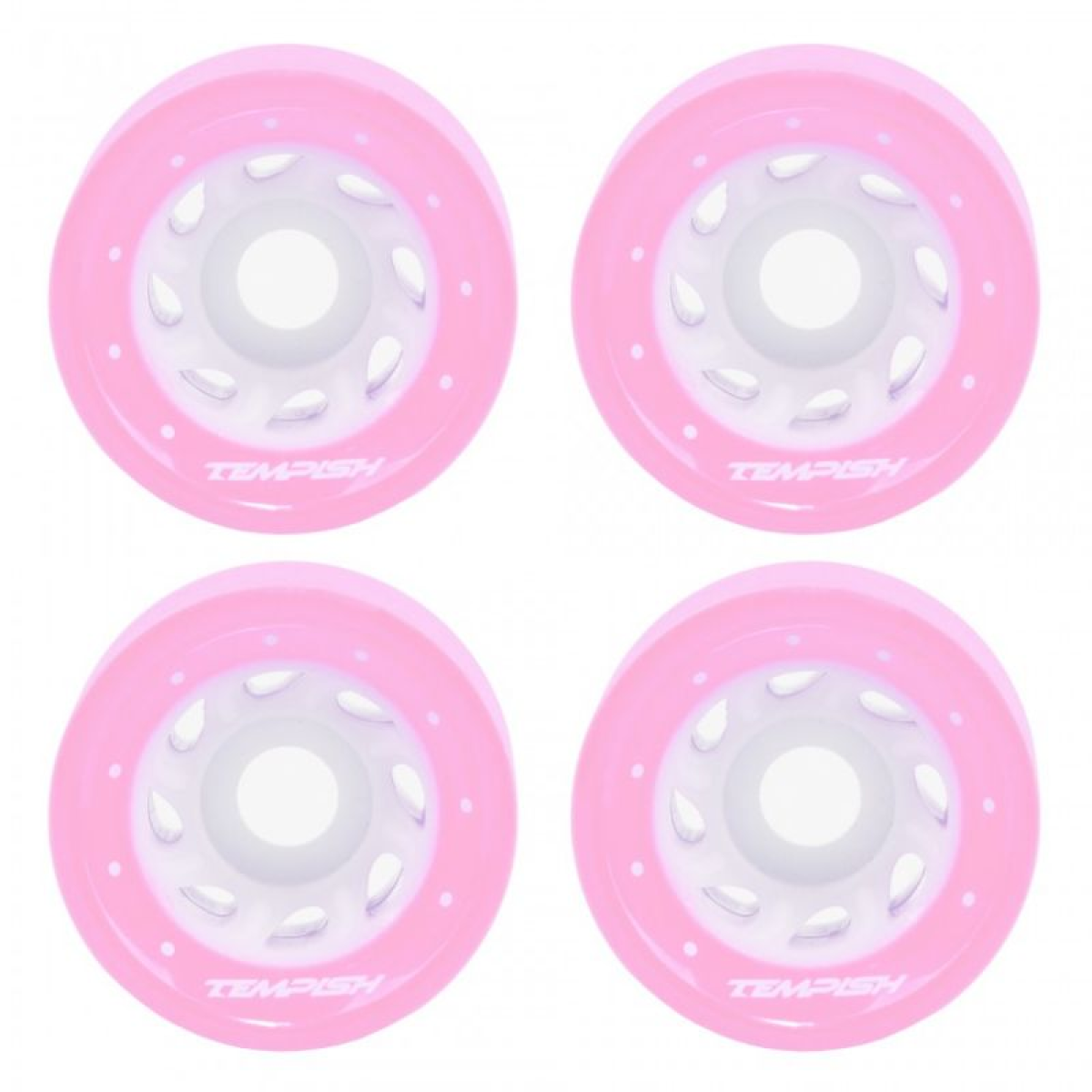 A set of four Quad roller skate wheels with extended durability and low rolling resistance. This series is suitable for skating on smooth surfaces. Color: pink. Application: recreational sports. Diameter: 57 mm. Hardness: 95 A. Number of wheels in the set: 4.