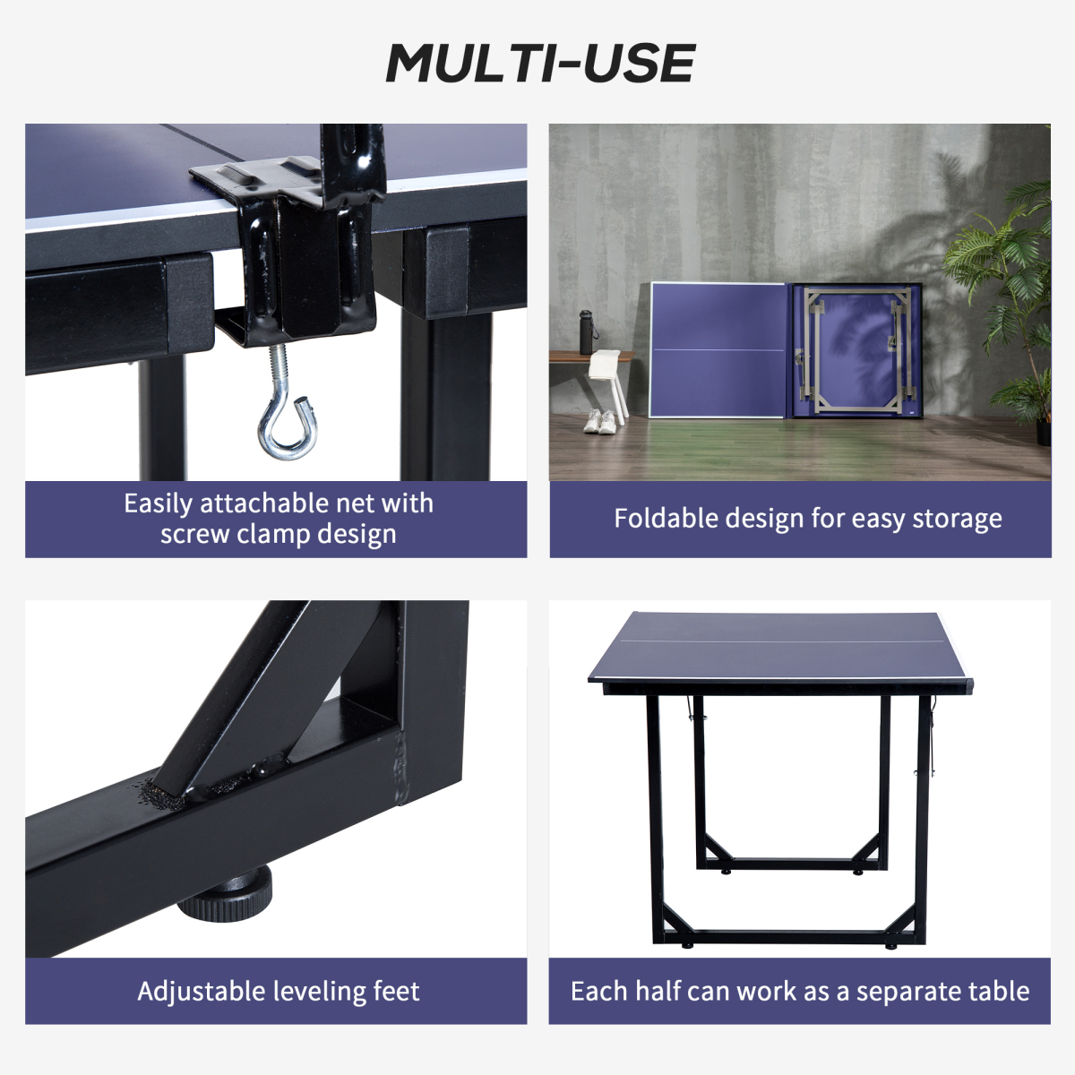 MULTI-USE: No assembly needed, ideal for small rooms, office entertainment or holiday outingsSPACE-SAVING DESIGN: Folding design, the legs can be fold in and place separate halves togethe each half separates for easy set up and storageHIGH QUALITY CONSTRUCTION: Metal frame of the table provides durability and stabilityREADY TO PLAY: The table set come with a high-quality net rack and net are included as accessories, ready to play the sportOverall Size: 182L x 91W x 76H cm