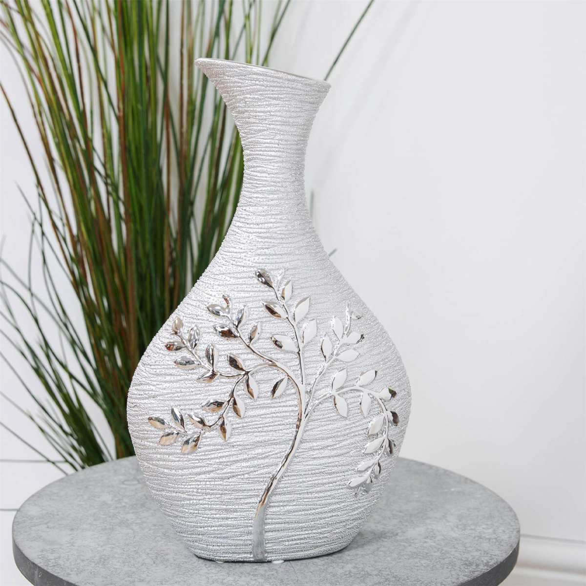 A beautifully elegant silver electroplated ceramic bottle shaped vase with tree design and textured finish. From the SIlver Luxe collection by HESTIA� - unparalleled glamour, style and elegance in contemporary home and gift.