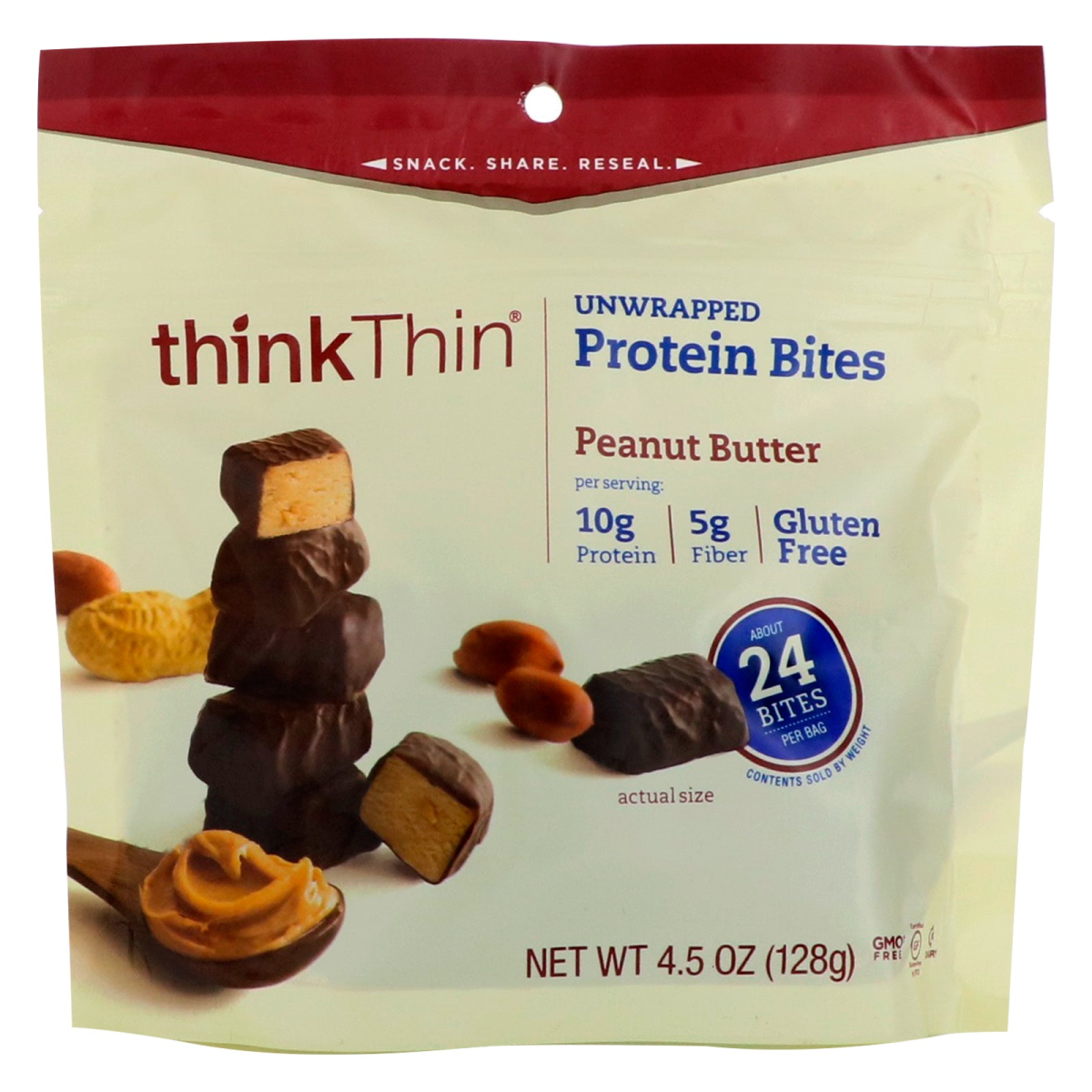 Snack - Share - Reseal Naturally Flavored Per Serving - 10 g Protein - 5 Fiber About 24 Bites Per Bag - Contents Sold by Weight †GMO Free Certified Gluten-Free by GFCO Kosher I know how hard it is to eat well when you're always on the go. Sometimes all you need is a delicious, little bite to help keep you happy, energized and satisfied. To your vitality, Lizanne Founder of thinkThin. Unwrapped Protein Bites Peanut Butter Snack smart and feel great with scrumptiously bite-sized and shareable thinkThin Protein Bites. Each serving of delicious Peanut Butter bites has 10 grams of protein, 5 grams of fiber, 170 calories - all wrapped in rich chocolate. These bite sized versions of your favorite thinkThin bars are perfect as a little treat, an on-the-go snack, or to share. †All ingredients have been produced without genetic engineering.