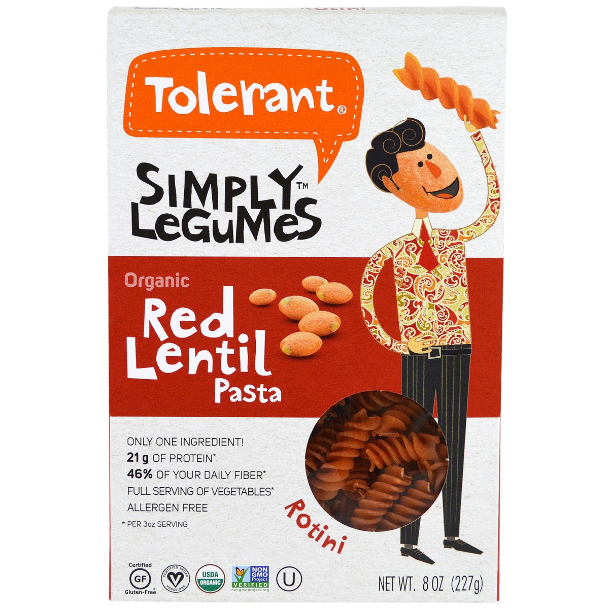 Only One Ingredient! 21 g of Protein* 46% of Your Daily Fiber* Full Serving of Vegetables* Allergen Free Certified Gluten Free Certified Vegan USDA Non-GMO Project Verified Cook Time: 8-10 mins Certified by Certifiers Eating healthy is easy, fun and friendly with Tolerant! A desire to help people feel great, age gracefully and Never be embarrassed about what they couldn't eat started it all. We make a difference in people's lives with one-of-a-kind products that are loaded with natural goodness, taste great and are anything but ordinary! Tolerant Simply Legumes takes just one ingredients and turns it into a delicious, totally nutritious, One of a kind pasta! Each great tasting serving is made entirely from a variety of legume. The single ingredient that naturally contains the nutritional value of a complete meal. It may look and taste like pasta but it's simply legumes! *Per 3 oz serving