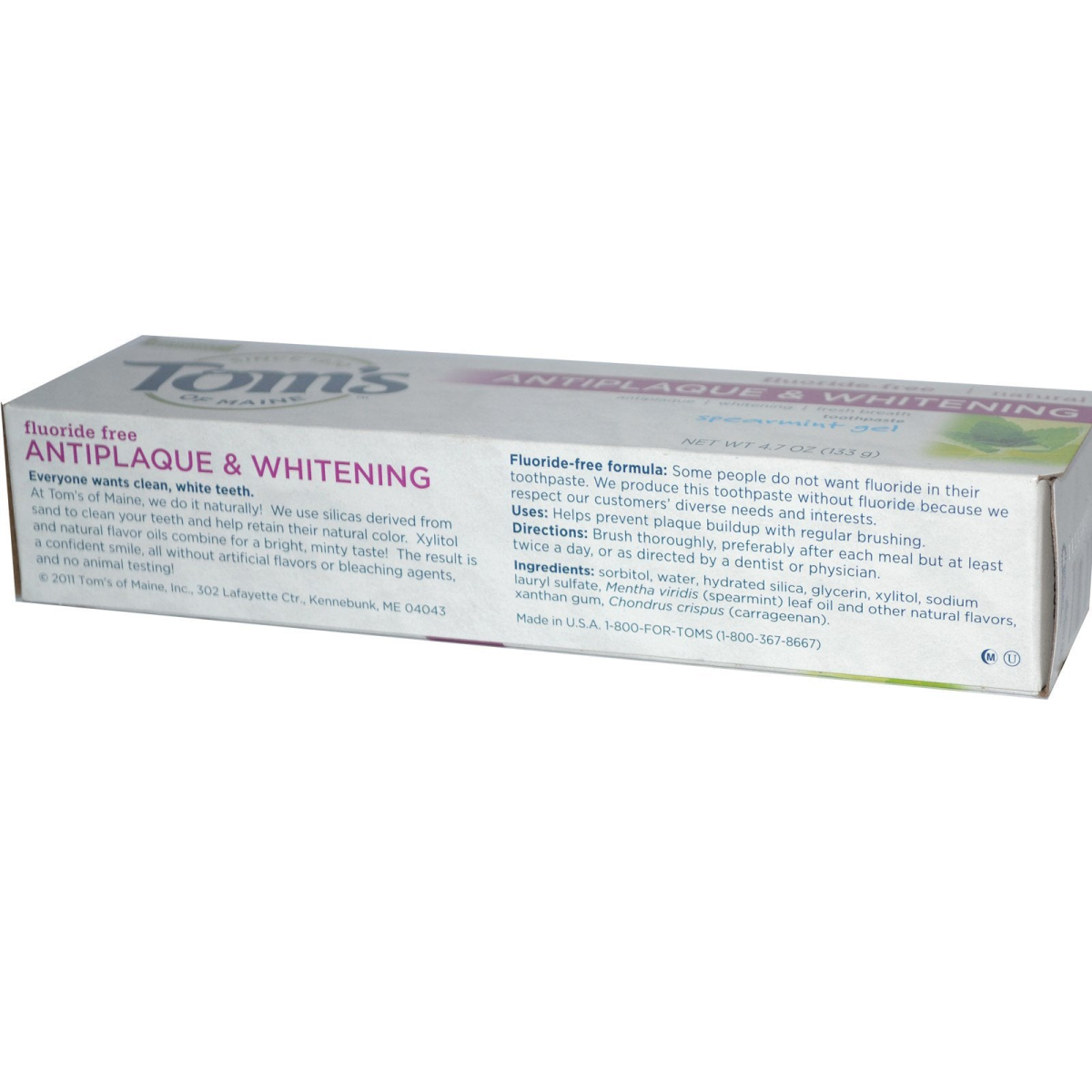 Tom's of Maine, Antiplaque & Whitening, Fluoride-Free Toothpaste, Spearmint Gel, 4.7 oz (133 g)