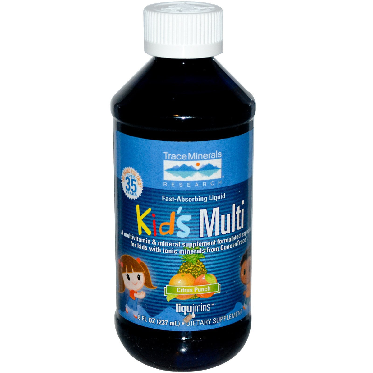 The Brand You Trust Over 35 Years Fast-Absorbing Liquid A Multivitamin & Mineral Supplement Formulated Especially for Kids with Ionic Minerals from ConcenTrace Dietary Supplement Gluten Free Certified Vegetarian Super Charged with ConcenTrace for Better Absorption Feel the Difference Kid's Multi is a dietary supplement formulated especially for Kids to provide them with vitamins, minerals and other key nutrients they need to promote and maintain optimum health. Also contains over 72 body balanced ionic trace minerals from ConcenTrace. ConcenTrace is a trade name for concentrated sea minerals from the Great Salt Lake.