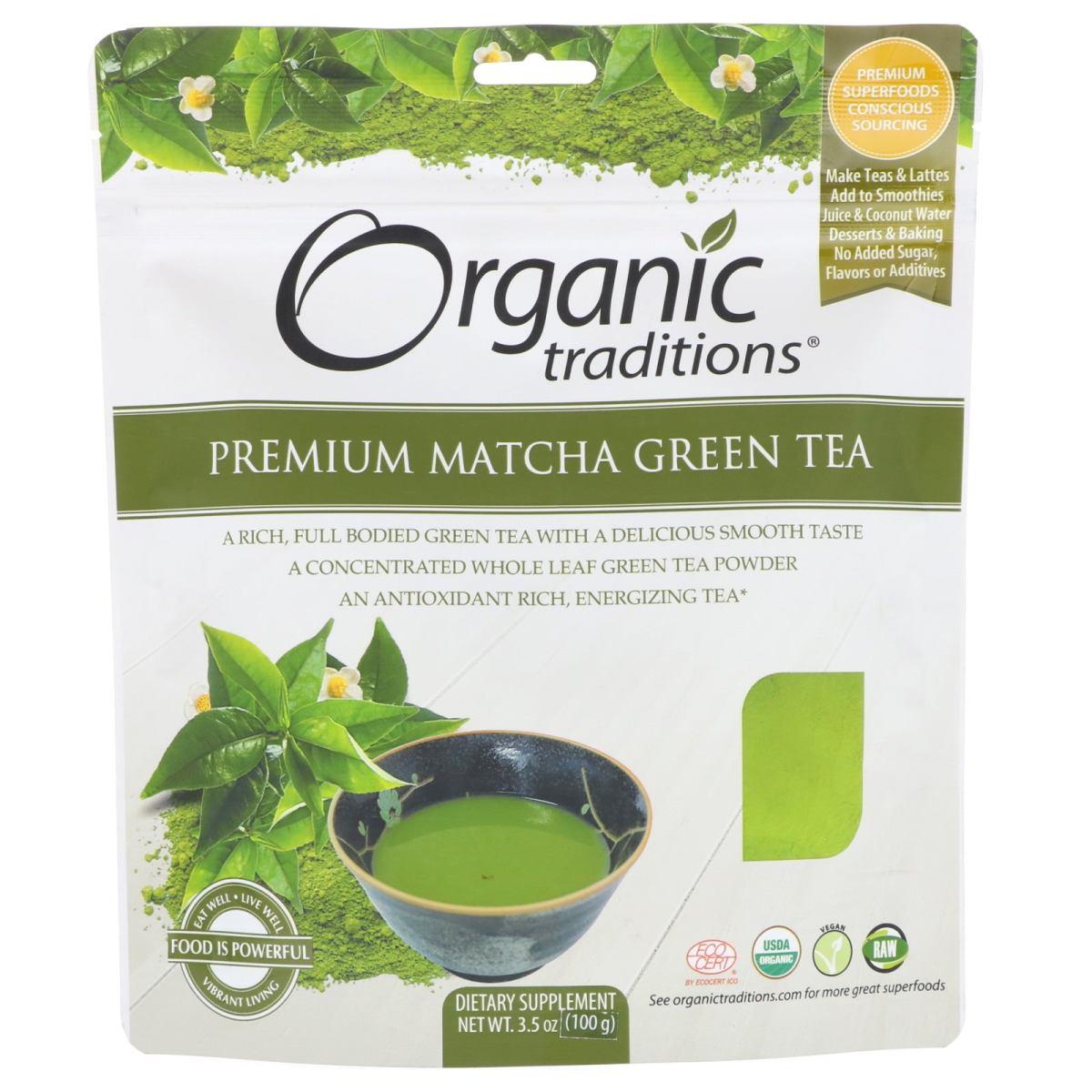 Premium Superfoods Conscious Sourcing Make Teas & Lattes Add to Smoothies, Juice & Coconut Water, Desserts & Baking No Added Sugar, Flavors or Additives A Rich, Full Bodied Green Tea with a Delicious Smooth Taste A Concentrated Whole Leaf Green Tea Powder An Antioxidant Rich, Energizing Tea Eat Well - Live Well - Food is Powerful - Vibrant Living Dietary Supplement Eco-Cert by Ecocert ICO USDA Vegan Raw Resealable Kosher Certified by: Ecocert ICO Premium Matcha Green Tea For centuries, Matcha has been considered the most revered green tea in the world. Traditionally used in the daily diet and for ceremonial purposes, it is said that Zen Buddhist Monks consumed Matcha for facilitating meditation, health longevity. There are many grades of Matcha. Lower, less expensive grades pulverize the stems with the leaves, creating a bitter taste and a yellow-green color. Some Matcha is prepared using hot pressure processing that destroys the delicate compounds, creating oxidation and consequently a lower quality Match, Premium Matcha comes from tencha leaves collected after the spring harvest. This full bodied green tea is ideal for daily use. Match is the most concentrated green tea in the world. - Camellia sinensis - Nutrition from Around the World At Traditions we provide nutrient dense superfoods from many healing traditions. We are committed to supporting farmers who are dedicated to the principles of sustainable and fair trade agriculture. Now more than ever we need to nourish ourselves with superfoods, herbs, seeds and fruits packed with the nutrition needed to support the challenges that come with living in a fast paced world. Be adventurous. These superfoods are versatile. Incorporate them into recipes in any creative way you see fit. At every meal you have the opportunity to choose dense nutrition. Food is powerful. Make choice for a better you and a better planet.