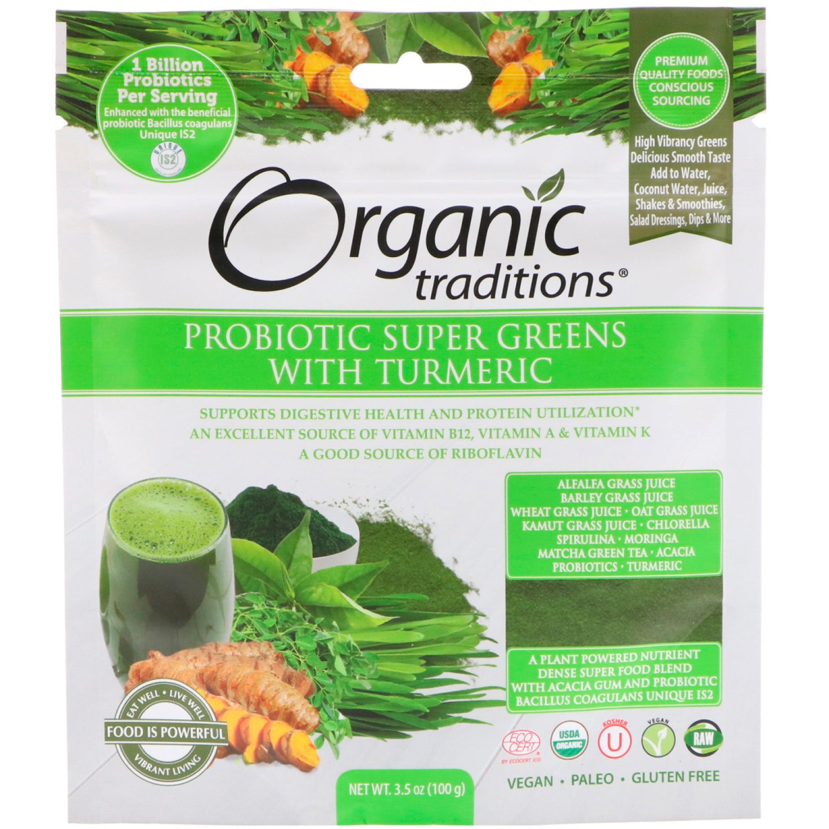 Supports Digestive Health and Protein Utilization An Excellent Source of Vitamin B2, Vitamin A & Vitamin K A Good Source of Riboflavin Eat Well - Live Well - Food is Powerful- Vibrant Living Alfalfa Grass Juice Barley Grass Juice Wheat Grass Juice Oat Grass Juice Kamut Grass Juice Chlorella Matcha Green Tea Acacia Probiotics Turmeric Eco-Cert by Ecocert ICO USDA Kosher Vegan Raw Vegan Paleo Gluten Free Certified by: Ecocert ICO 1 Billion Probiotics Per Serving Enhanced with the beneficial probiotic Bacillus coagulans Unique IS2. Premium Quality Foods Conscious Sourcing - High Vibrancy Greens Deliciously Smooth Taste Add to Water, Coconut Water, Juice, Shakes & Smoothies, Salad Dressings, Dips & More. A plant powered nutrient dense super food blend with acacia gum and probiotic bacillus coagulans unique IS2. 100% Juiced Grasses For optimal digestion and assimilation. No whole dried grass. 16 grams of Fresh Turmeric in 1 Serving Enhanced with supercritical plus hydroethanolic dual extracted Turmeric root, one of the world's most revered herbs for optimal benefits. Probiotics Super Greens With Turmeric Traditions Probiotic Super Greens Blend is the ultimate alkalizing, nutrient-dense greens formula made from the young, juiced grasses of alfalfa, barley, kamut, oat and wheat in their vegetable state, 2 of nature's most nourishing algae chlorella and spirulina, moringa, match green tea, turmeric powder extract as well as pre and probiotics. These powerful young, green grasses contain an abundance of chlorophyll, vitamins, minerals and antioxidants. Combined with the fresh water green microalgae, spirulina and broken cell wall chlorella, this blend is enhanced with moringa, matcha green tea and dual extract supercritical plus hydroethanolic turmeric root extract for optimal benefits. Enjoy the best in green phyto-nutrition along with 1 billion beneficial probiotics per 1 tbsp. serving for optimal digestive health. *The premium probiotic strain Bacillus coagulans unique IS-2 has an excellent survivability, stability, safety and efficacy. It survives stomach acidity and does not require refrigeration. The addition of Acacia Gum prebiotic fiber makes this an all in one pre and probiotic blend thereby making this symbiotic greens formula. When blended into water or juice, it is the freshest green elixir you have ever experienced. Mix up to 1 tablespoon (1-3 teaspoons) into 8-16 oz. of water, coconut water, juices, smoothies or any recipe that you want to a boost with vibrancy green nutrition. Make pesto, raw vegetable soups, salad dressings, dips and more. Nutrition From Around The World At Traditions we provide nutrient dense foods from many traditions. We are committed to supporting farmers who are dedicated to the principles of sustainable and fair trade agriculture. Now more than every we need to nourish ourselves with foods, herbs, seeds and fruits packed with the nutrition needed to support the challenges that come with living a fast paced world. Be adventurous. These foods are versatile. Incorporate them into recipes in any creative way you see fit. At every meal you have the opportunity to choose dense nutrition. Food is powerful. Make choice for a better you and a better planet. *As part of a balanced diet and healthy lifestyle
