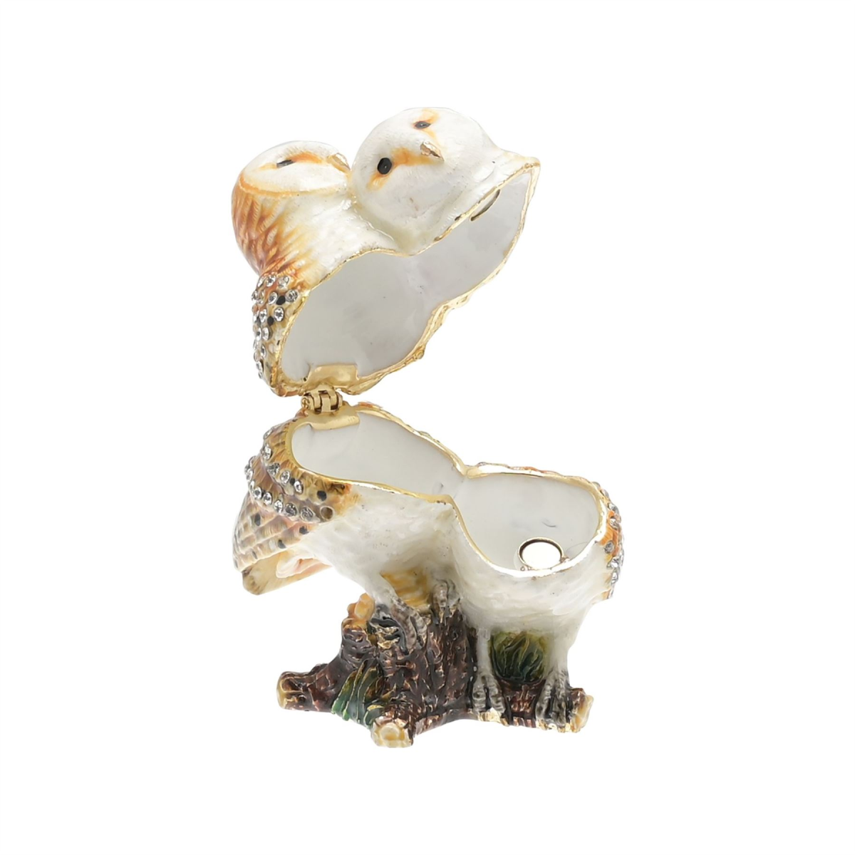 It features a beautifully hand-painted finish throughout, complete with distinctive shades of brown, white and orange, alongside crystal embellishments. Their bodies open to reveal a white, smooth finish storage compartment, in which to protect treasured possessions and jewellery.