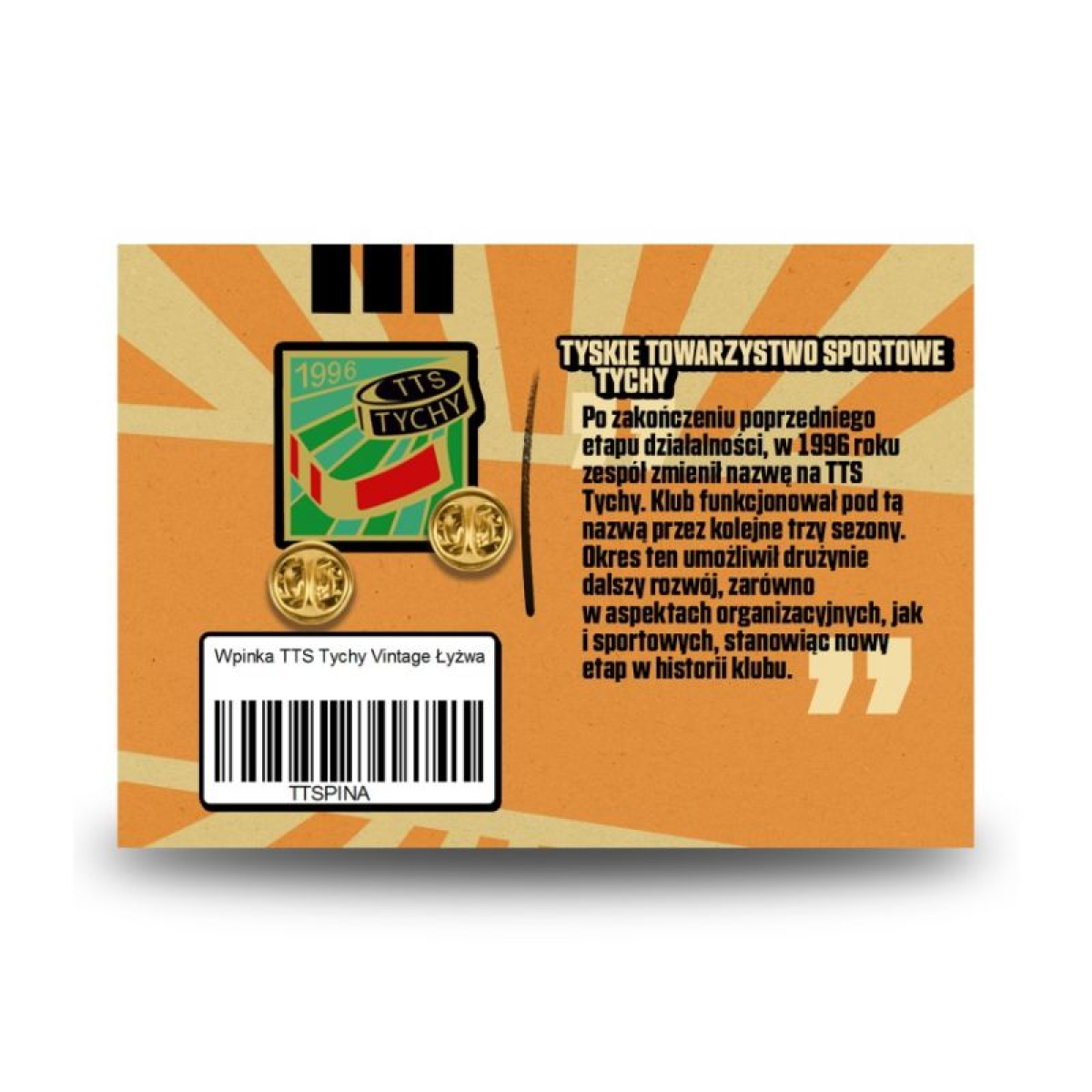 The TTS Tychy Vintage Ice Skate Pin is a unique accessory for hockey fans and the TTS Tychy club, inspired by the classic style of hockey footwear. Key features: Unique design: Stylized ice skate with the TTS Tychy crest and details in club colors. High-quality material: Metal crafted with a precise gold finish. Clasp: Solid and reliable, allowing easy attachment to clothing, backpacks, or bags. Dimensions: 28 mm x 35 mm Collectible design: The perfect accessory for fans and collectors of sports memorabilia. The TTS Tychy Vintage Ice Skate Pin is a perfect way to show your support for the team and your passion for hockey!