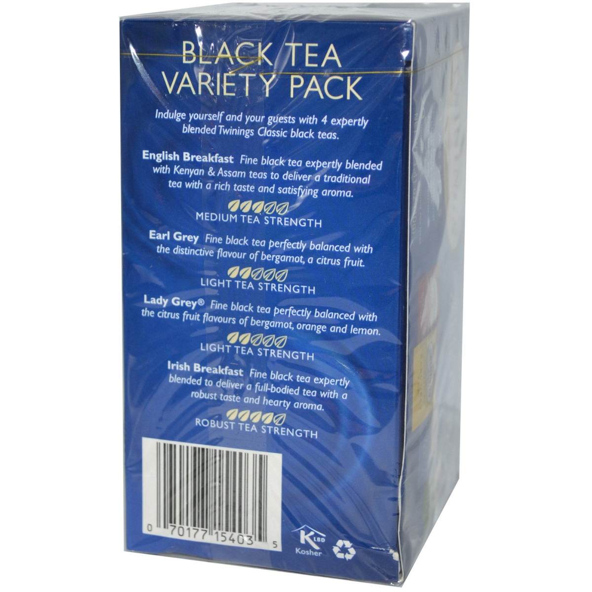 Contains Four Traditional Black Tea Flavors Five Bags Per Flavor Kosher Tea is a Natural Source of Antioxidants Black Tea Variety Pack Indulge yourself and your guest with 4 expertly blended Twinings Classic black teas. English Breakfast fine black tea expertly blended with Kenyan & Assam teas to deliver a traditional tea with a rich taste and satisfying aroma. Medium Tea Strength Earl Grey fine black tea perfectly balanced with the distinctive flavor of bergamot, a citrus fruit. Light Tea Strength Lady Grey fine black tea perfectly balanced with the citrus fruit flavors of bergamot, orange and lemon. Light Tea Strength Irish Breakfast fine black tea expertly blended to deliver a full-bodied tea with a robust taste and hearty aroma. Robust Tea Strength Classics Traditional Style Black Teas For over 300 years, Twinings has been sourcing and blending the finest, high-quality teas from around the globe to ensure that your tea has the perfect balance of tea taste, flavor and aroma. Twinings blends to perfection the finest black teas to give you a line of great-tasting teas with an enticing flavor, fresh taste and invigorating aroma.