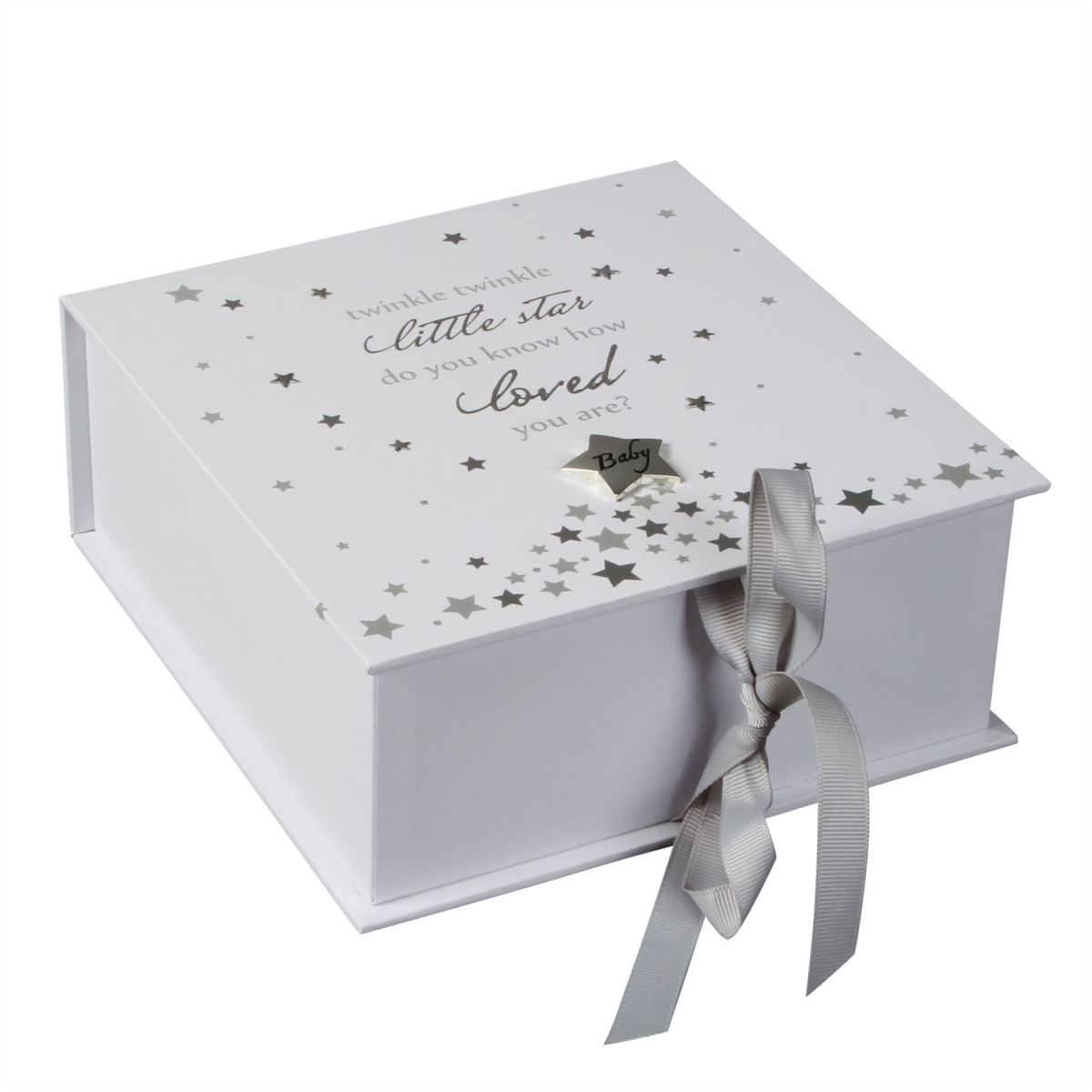- Silver "twinkle twinkle little star, do you know how loved you are?" sentiment on the lid