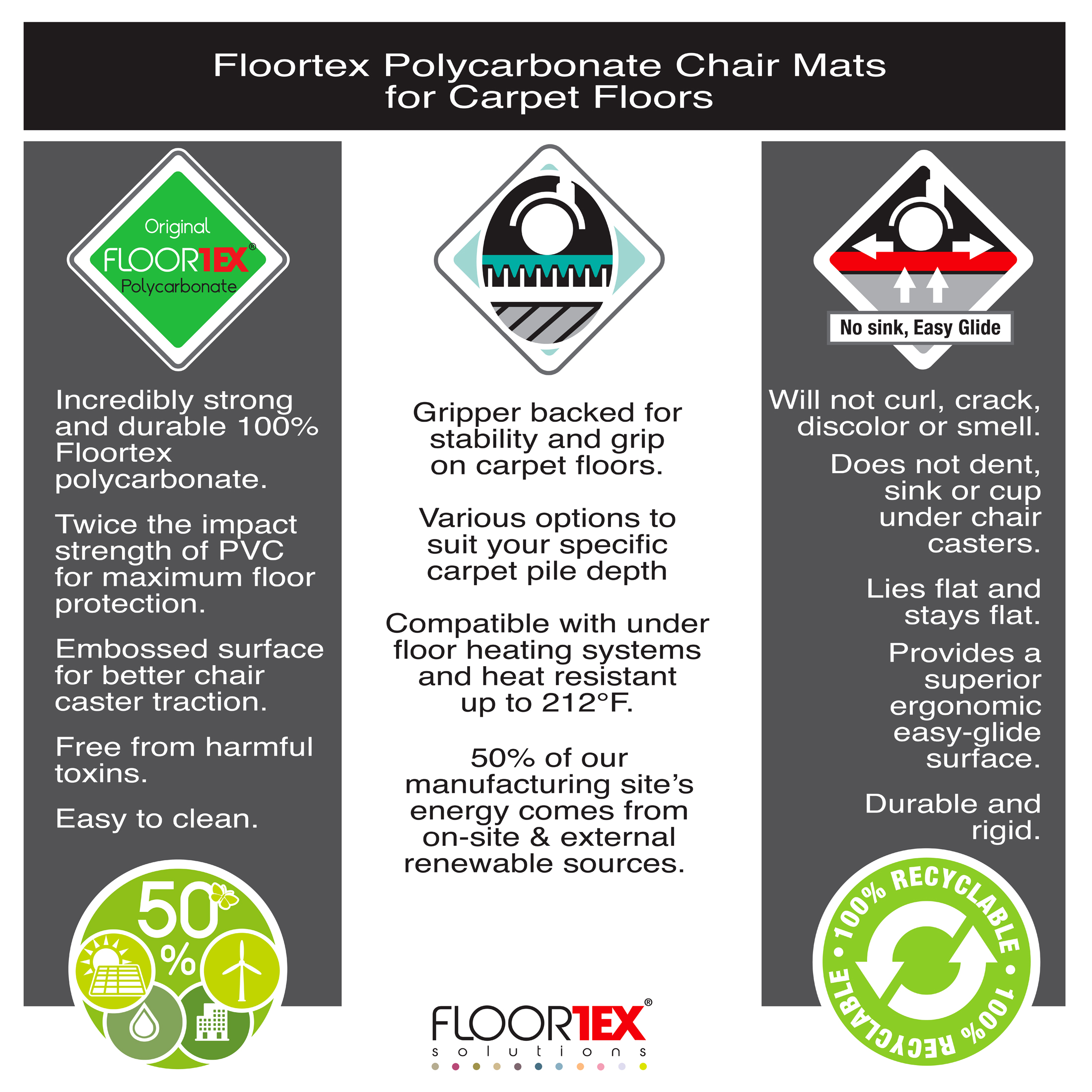 Cleartex Ultimat polycarbonate chair mats are the ultimate in quality and durability in floor protection and ergonomics. These high clarity chairmats for carpeted flooring are made from Floortex Original polycarbonate, which has double the impact strength of PVC and will not crack, curl, discolour or smell.