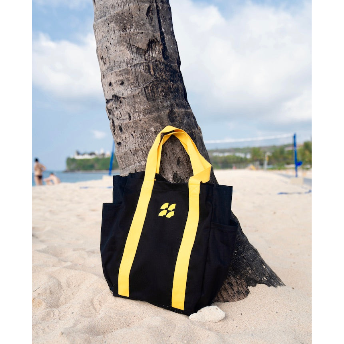 Whether you’re heading out for a beach day or a morning of running errands, the Utility Tote is the ideal companion. It features a built-in laptop compartment, an inside zip pocket for essentials, and two outside pockets perfect for bottles or grab-and-go items. Two strap lengths give you flexible carry options, while a magnetic snap button keeps everything secure. Black with yellow accents, it’s unmistakably Seven Clean Seas.