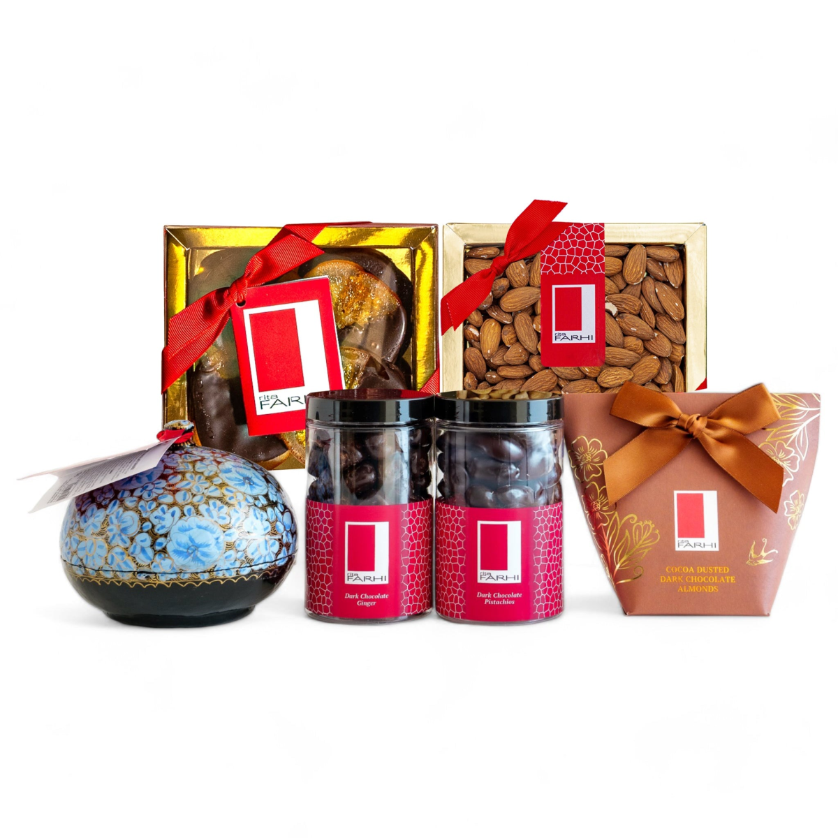 Explore our Vegan Luxury Hamper, a curated selection of vegan gourmet treats. Experience the rich, nutty flavour of Cocoa Dusted Almonds, the delightful sweetness of Dark Chocolate Covered Raisins, and the classic taste of perfectly roasted Almond Nuts. Uncover our signature handmade Bonbonniere filled with Dark Chocolate Coffee Beans and savour the unique combination of Dark Chocolate Coated Pistachios and the chocolate-dipped orange slicesices. This luxurious hamper is the perfect gift for vegans and vegetarians.