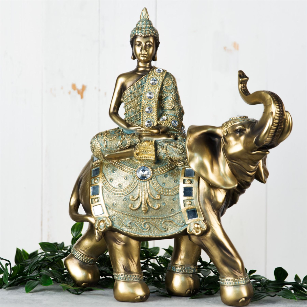 The Buddha sits in deep meditation atop an elephant. In Buddist culture the elephant represents strength and steadfastness whilst the meditating Buddha represents concentration. This beautiful piece has a intricate verdigris design with crystal and mirror detail and a bronze finish. A stunning home ornament for promoting spirituality.
