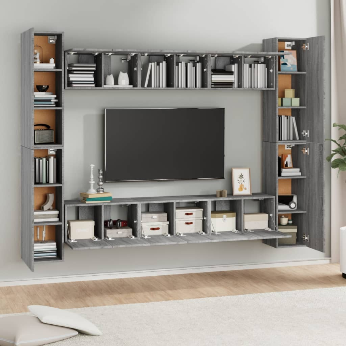 This classic TV cabinet set is designed to be a focal point of your room, featuring a trendy yet practical design. Sturdy material: The engineered wood is of exceptional quality with smooth surface and also features strength, stability and resistance to moisture.Ample storage: Each TV stand provides ample storage space to keep all your magazines, DVDs and any other items well organised.Wall-mounted design: The TV unit doesn't take any floor space. You can hang it on the wall easily. Note:Screw(s) and plug(s) for inside the wall are not included. Seek and use screw(s) and plug(s) suitable for your walls. If you are uncertain, seek professional advice. Read and follow each step of the instruction carefully.Each product comes with an assembly manual in the box for easy assembly.