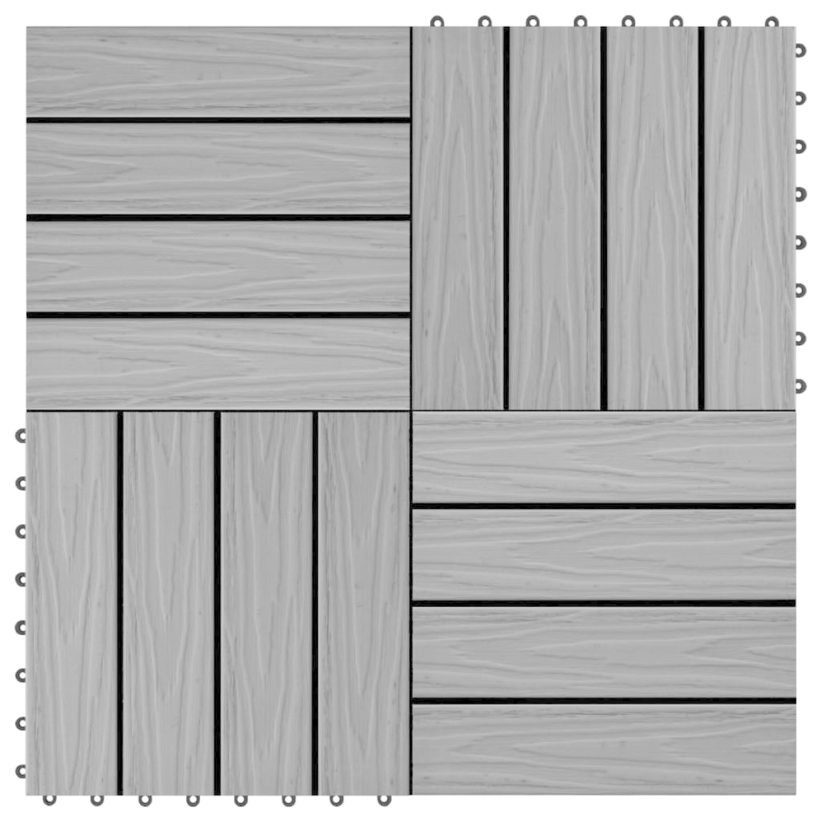 The deep-embossed WPC decking tile set, with an individual tile size of 30 x 30 cm, consists of 11 pieces and covers a total surface area of 1 square metre. It will give a clean look to your patio, balcony, bathroom, or your pool or spa area. These deep-embossed floor tiles have unique tangible 3D grains, which create a realistic and natural wood look but also make the tiles nonslip. Thanks to the drainage grid, water will not accumulate on the tiles. These high-quality WPC tiles feature a quick connect interlocking system, allowing you to easily and quickly install them without the need for tools. Our deep-embossed tiles are water and weather resistant. The WPC material combines wood and plastic, which gives it unique properties: highly durable, and easy to maintain.