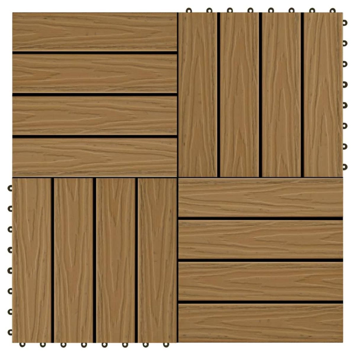 The deep-embossed WPC decking tile set, with an individual tile size of 30 x 30 cm, consists of 11 pieces and covers a total surface area of 1 square metre. It will give a clean look to your patio, balcony, bathroom, or your pool or spa area. These deep-embossed floor tiles have unique tangible 3D grains, which create a realistic and natural wood look but also make the tiles nonslip. Thanks to the drainage grid, water will not accumulate on the tiles. These high-quality WPC tiles feature a quick connect interlocking system, allowing you to easily and quickly install them without the need for tools. Our deep-embossed tiles are water and weather resistant. The WPC material combines wood and plastic, which gives it unique properties: highly durable, and easy to maintain.