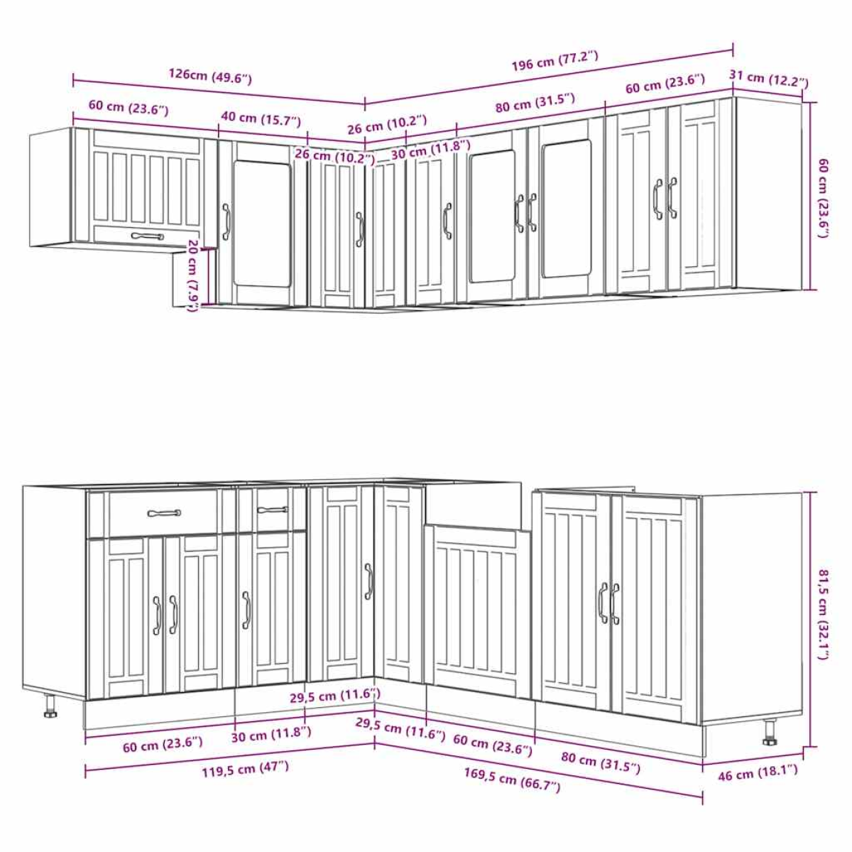 This 11-piece kitchen cabinet set, with its elegant design, optimises your kitchen space and provides ample storage space for your personal belongings! Stable and durable material: Engineered wood is a durable and stable material with a smooth surface that is resistant to moisture, warping, and splitting, making it a reliable choice for a variety of projects.Ample storage space: The kitchen cabinet set has many compartments, and offers sufficient space to store bowls, plates, pots, and other kitchen appliances.Adjustable feet: The bottom cabinets feature adjustable feet that can be adjusted in height to suit your kitchen layout.Easy to maintain: Thanks to its smooth surface, these kitchen cabinets are easy to clean with a damp cloth and require less maintenance. Warning:To prevent it from tipping over, this product must be used with the provided wall attachment device. Good to know:Screw(s) and plug(s) for inside the wall are not included. Seek and use screw(s) and plug(s) suitable for your walls. If you are uncertain, seek professional advice. Read and follow each step of the instruction carefully.The worktop, sink and faucet are not included in the delivery.
