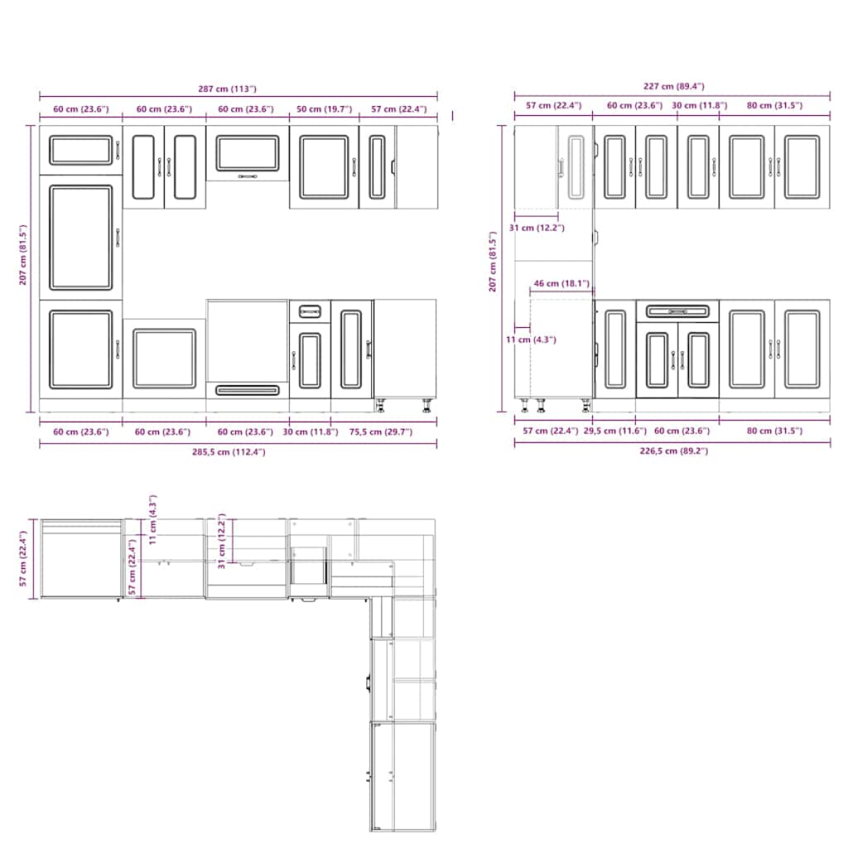 • 1 x Kitchen wall corner cabinet: 57 x 57 x 60 cm (W x D x H)