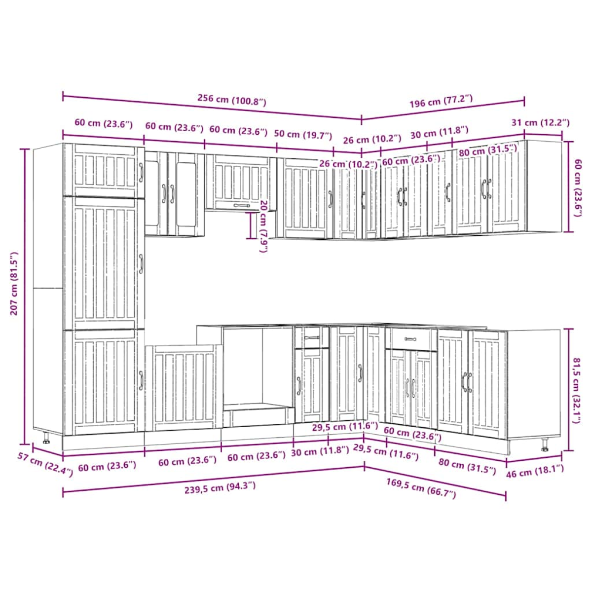 This 14-piece kitchen cabinet set, with its elegant design, optimises your kitchen space and provides ample storage space for your personal belongings! Stable and durable material: Engineered wood is a durable and stable material with a smooth surface that is resistant to moisture, warping, and splitting, making it a reliable choice for a variety of projects.Ample storage space: The kitchen cabinet set has many compartments, and offers sufficient space to store bowls, plates, pots, and other kitchen appliances.Adjustable feet: The bottom cabinets feature adjustable feet that can be adjusted in height to suit your kitchen layout.Easy to maintain: Thanks to its smooth surface, these kitchen cabinets are easy to clean with a damp cloth and require less maintenance. Warning:This product must be secured by installing a worktop. Good to know:Screw(s) and plug(s) for inside the wall are not included. Seek and use screw(s) and plug(s) suitable for your walls. If you are uncertain, seek professional advice. Read and follow each step of the instruction carefully.The worktop, sink and faucet are not included in the delivery.